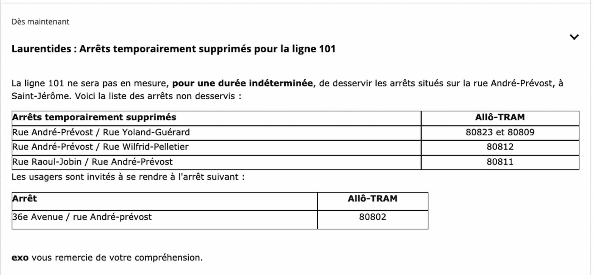 « Dans la rue près de chez moi, on avait prolongé le trajet de l'autobus 101 jusqu'au bout de la rue André-Prévost. L'autobus ne vient plus parce que le déneigement ne permet pas au bus de faire demi-tour. Il semble aussi que certains résidents n'apprécient pas le passage du bus dans les rues ainsi rétrécies. Les résidents du secteur doivent maintenant marcher jusqu'à la 36e avenue. »
