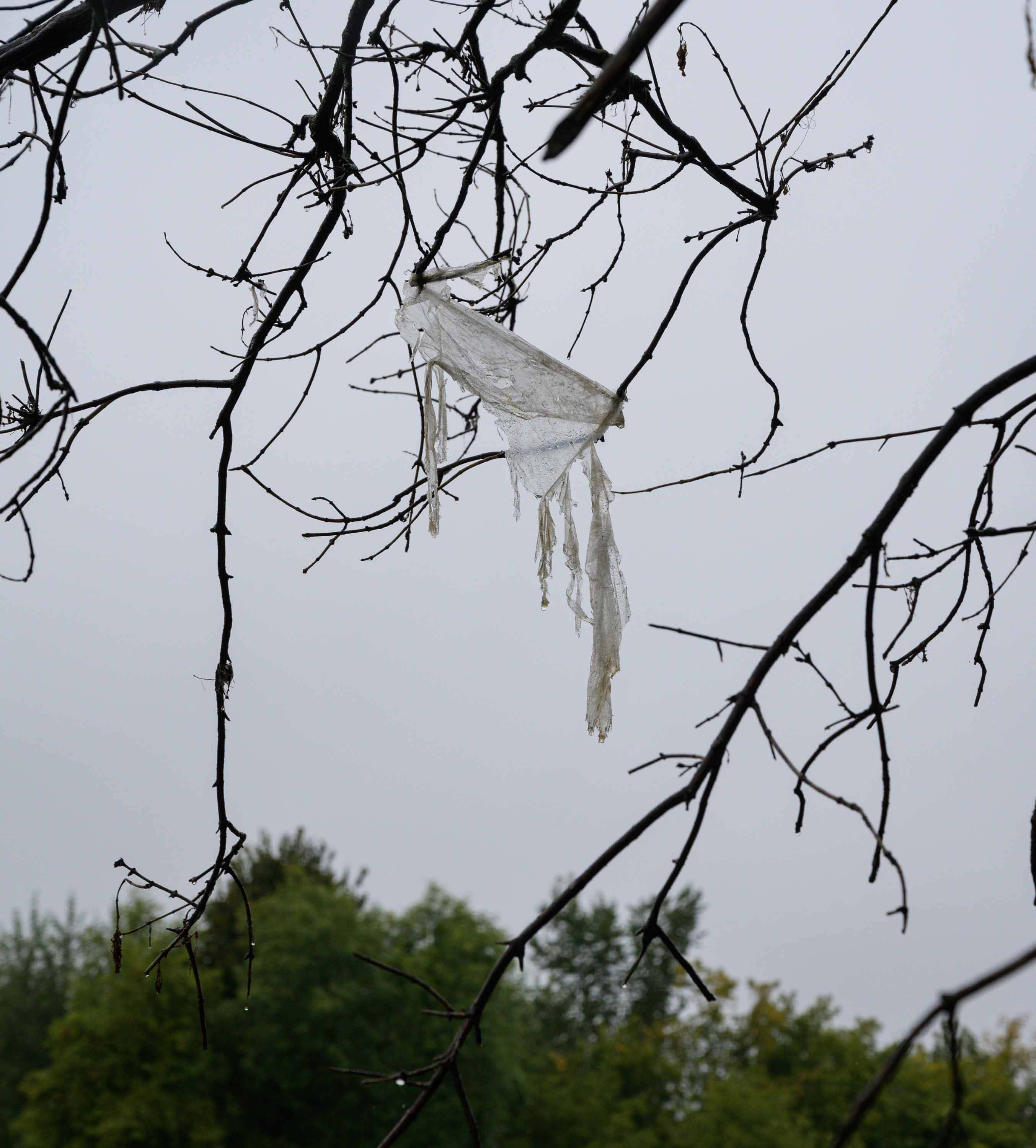 Le plastique demeure l'un des pires ennemis de l'environnement parce qu'il est pratiquement indestructible... De plus, il n'est pas rare que la crue printanière des rivières transporte des résidus jusqu'à la hauteur des branches, où ils restent ensuite accrochés.