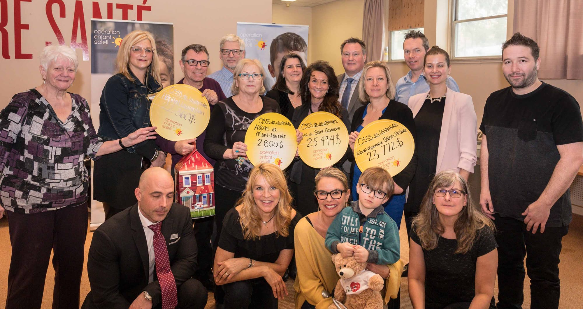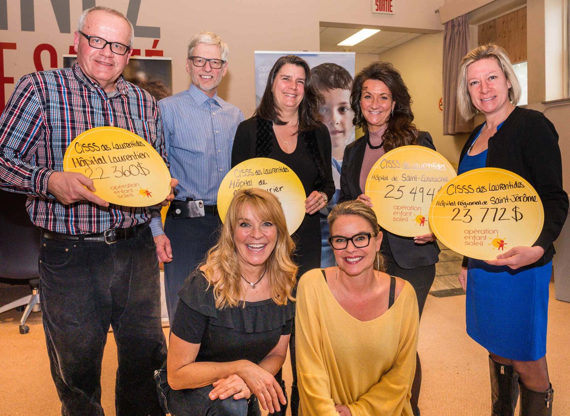 Depuis 1988, les contributions d'Opération Enfant Soleil totalisent plus de 1,2 M$ dans les Laurentides, dont environ 450 000$ pour l'hôpital de Saint-Jérôme, près de 300 000$ pour l'hôpital de Saint-Eustache, environ 60 000$ pour l'hôpital de Sainte-Agathe et plus de 35 000$ pour l'hôpital de Mont-Laurier.