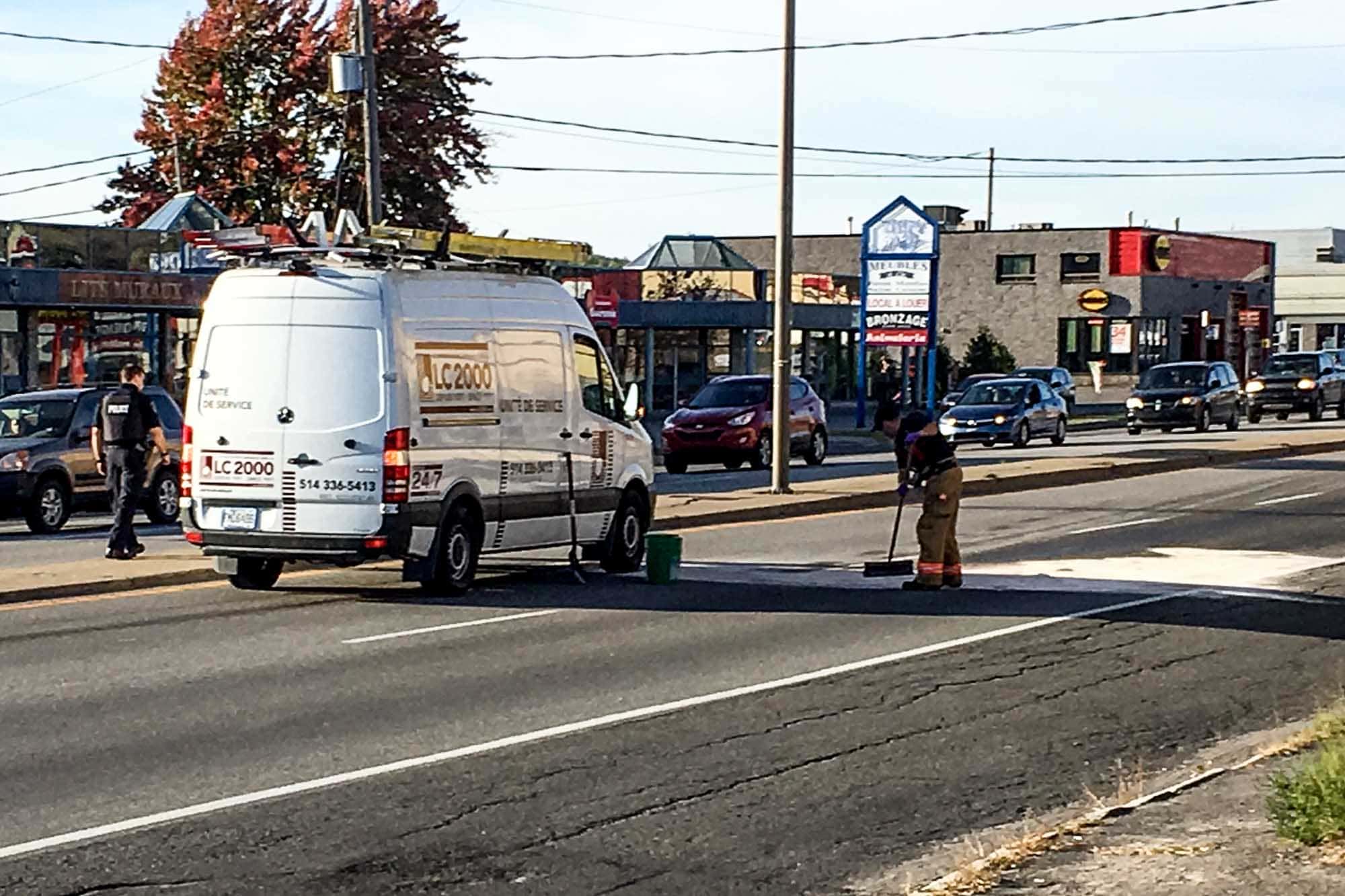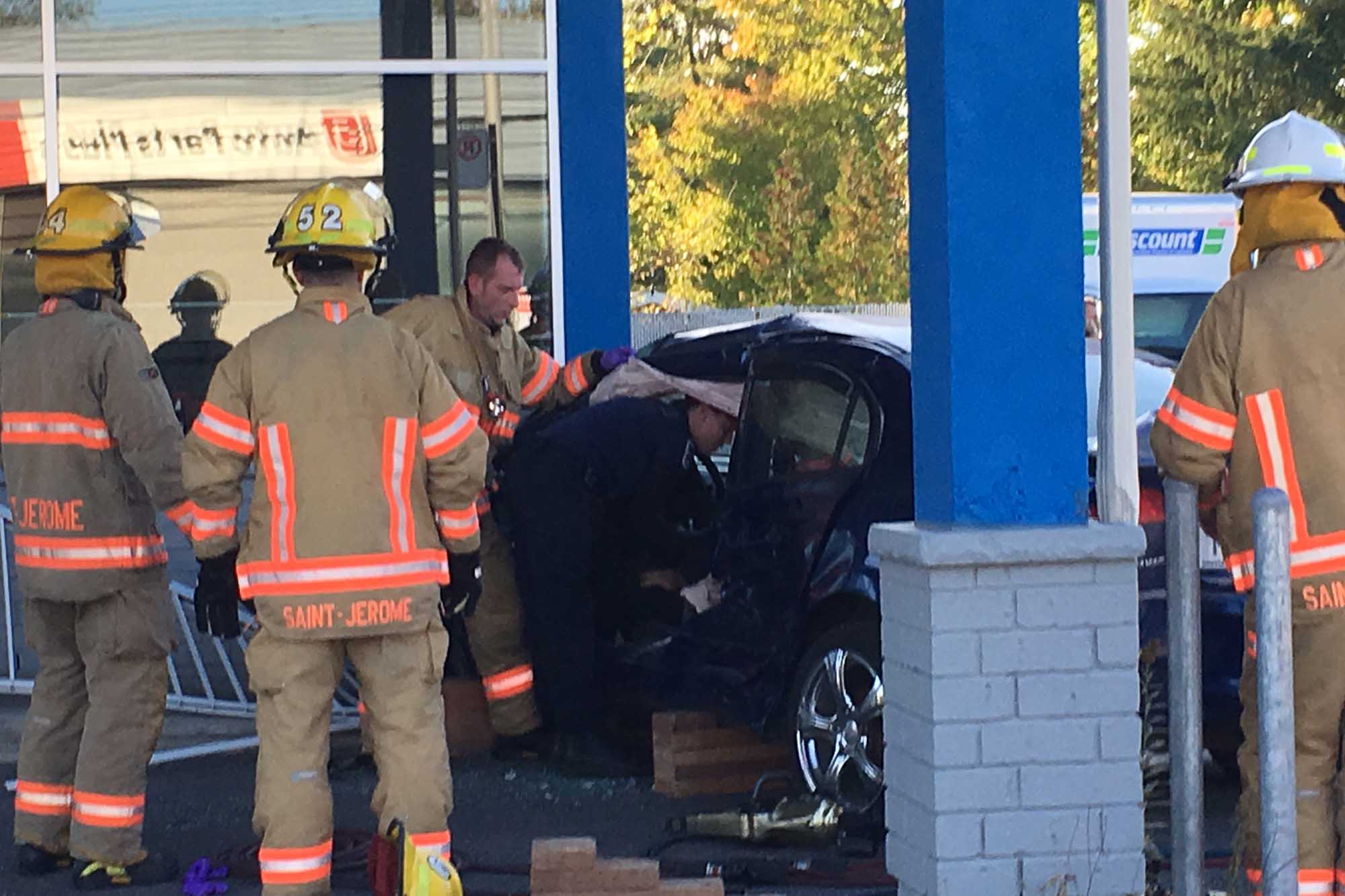 La scène est complexe. Une collision semble s'être produite sur la route au coin de la 106e avenue. Une voiture bleue était arrêtée près de l'édifice de location de voitures Discount. Peu avant 17h, les pompiers tentaient de libérer la conductrice avec les pinces de désincarcération, vu l'état du véhicule.