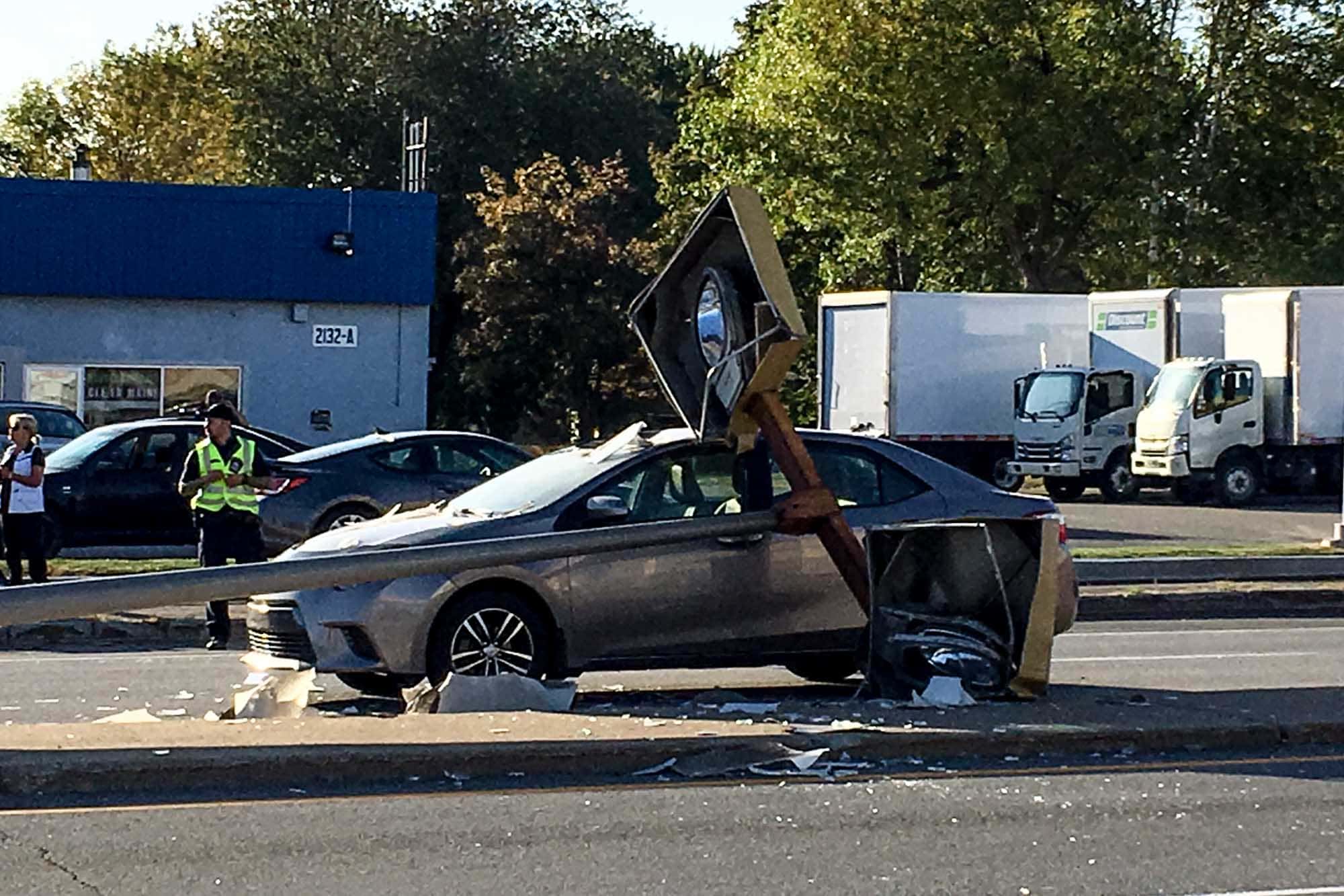 Une voiture grise était arrêtée dans la voie de gauche en direction sud, peu avant la 106e avenue. Un lampadaire qui surplombe habituellement le terre-plein tombé sur le toit du véhicule.