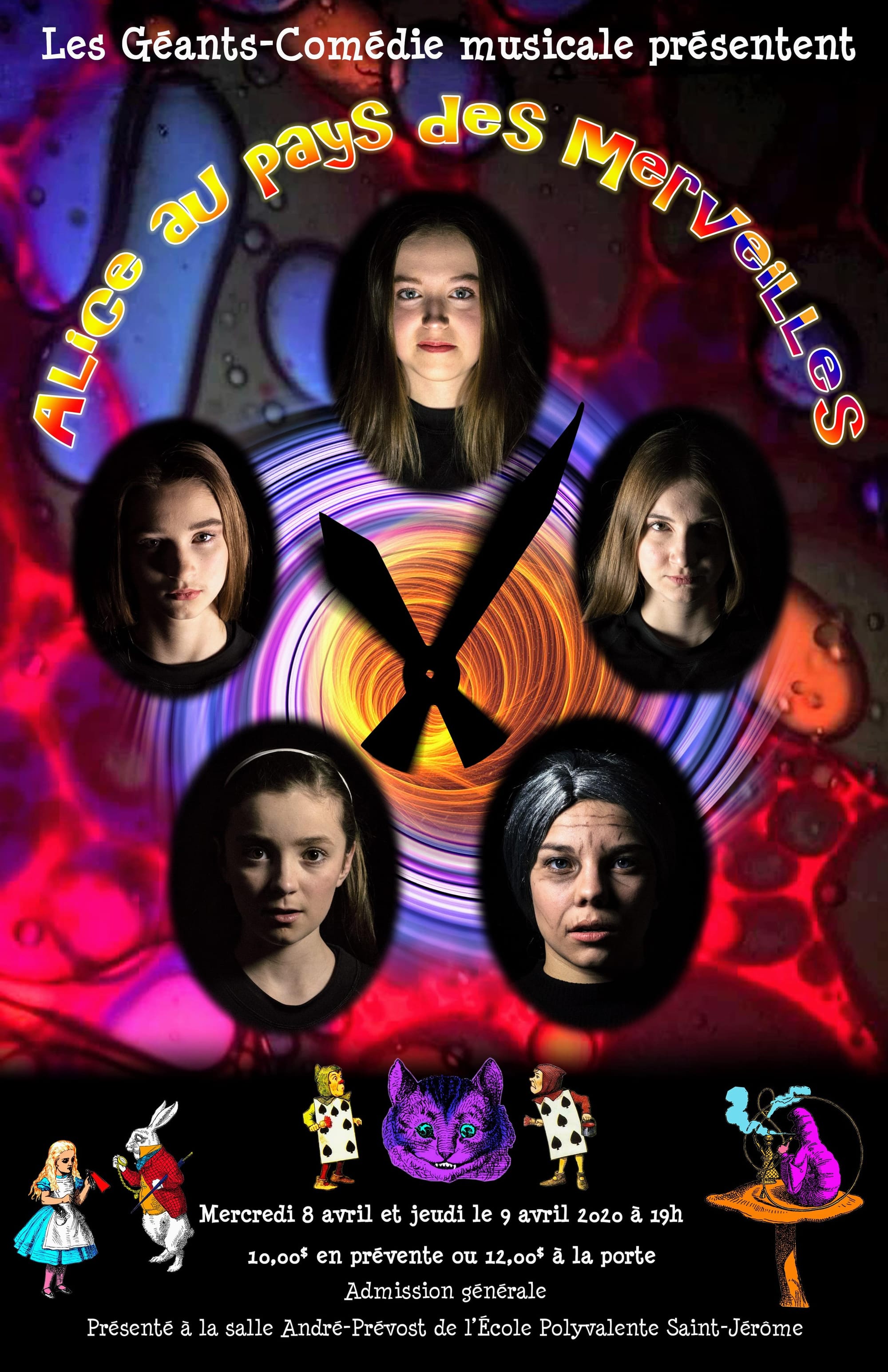 Les 8 et 9 avril derniers devaient avoir lieu les 5 représentations du spectacle Alice au pays des merveilles, par la troupe des Géants Comédie musicale de la Polyvalente St-Jérôme. Environ 4000 spectateurs (élèves et grand public) étaient attendus pour l'aboutissement du travail des 45 jeunes impliqués dans cette aventure scénique amorcée depuis octobre 2019.