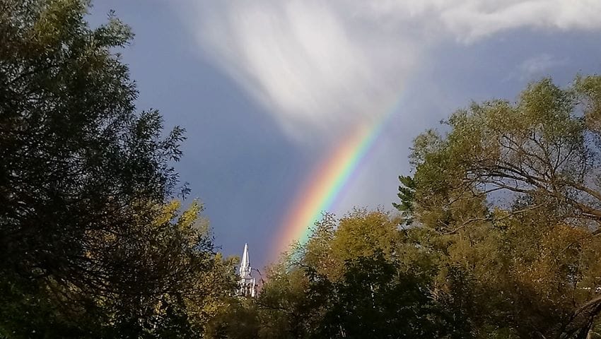 Trêve de rêveries, je veux aussi remercier Catherine Monette Gingras, qui nous a envoyé l'image qui suit, prise à partir de la rue Boyer, où l'on aperçoit le plus haut clocher de Saint-Jérôme: Cathédrale sous les arcs-en-ciel.