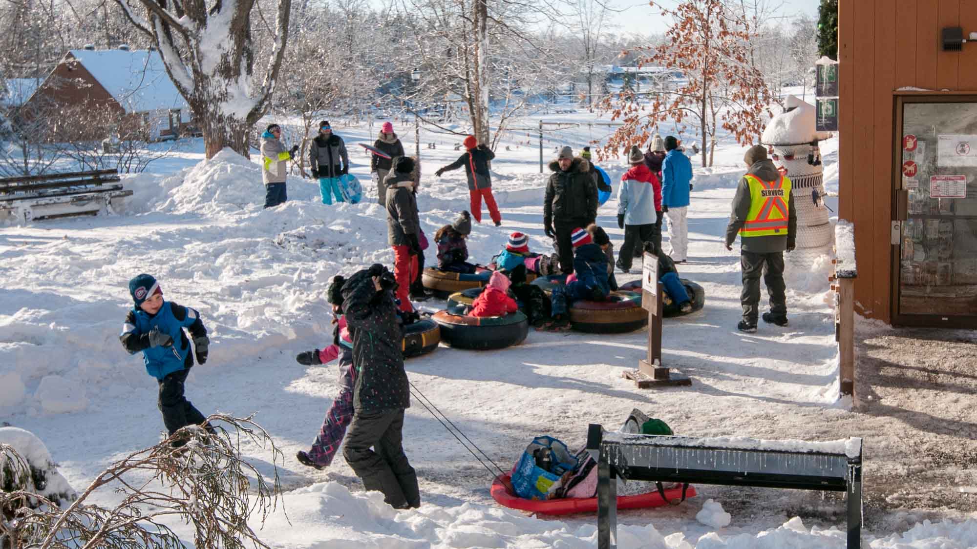 Enfin, une glissade d’une hauteur de 20 mètres offre un corridor de glisse qui fera le bonheur des petits et des grands. Les visiteurs peuvent apporter leur traîneau ou tout autre équipement de glisse. Il est aussi possible de louer des tubes sur place.