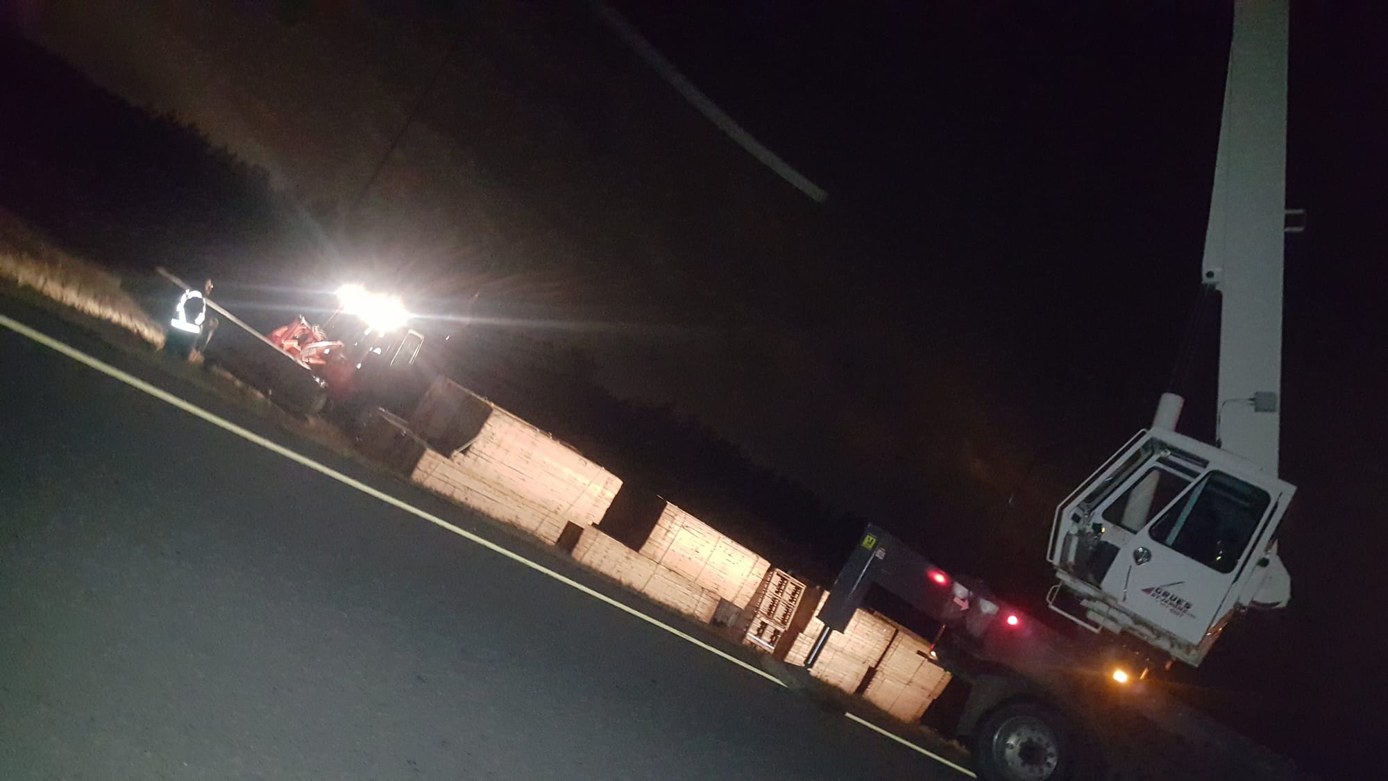 Ensuite, on a mobilisé une grue qui a sorti les ballots de bois du fossé pour les déposer sur un autre véhicule.