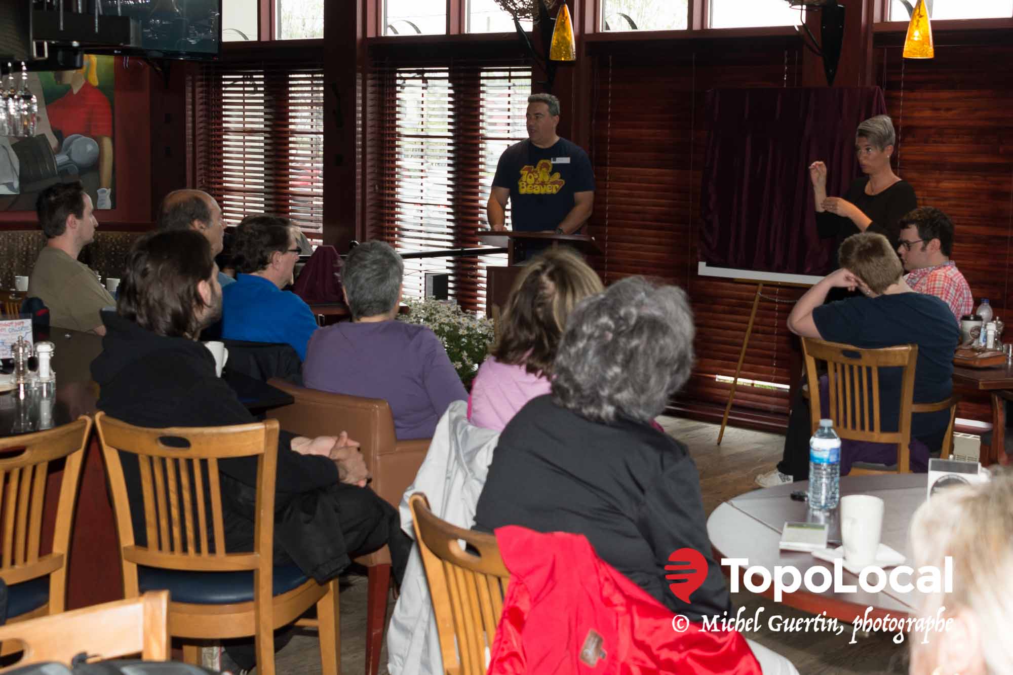 Le St-Hub de Sainte-Adèle est plein, mais c'est le silence complet. Plein de gens comme vous et moi écoutent deux personnes qui parlent.