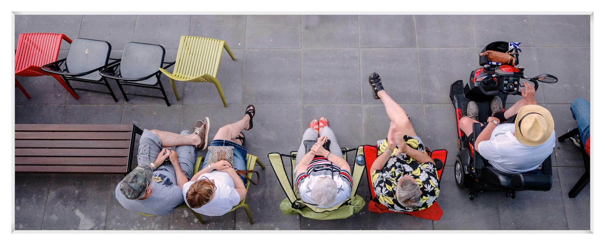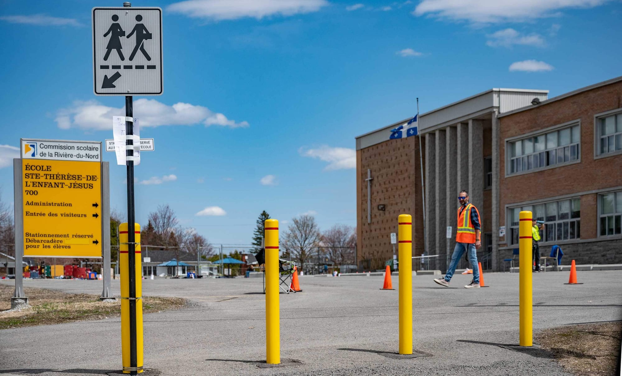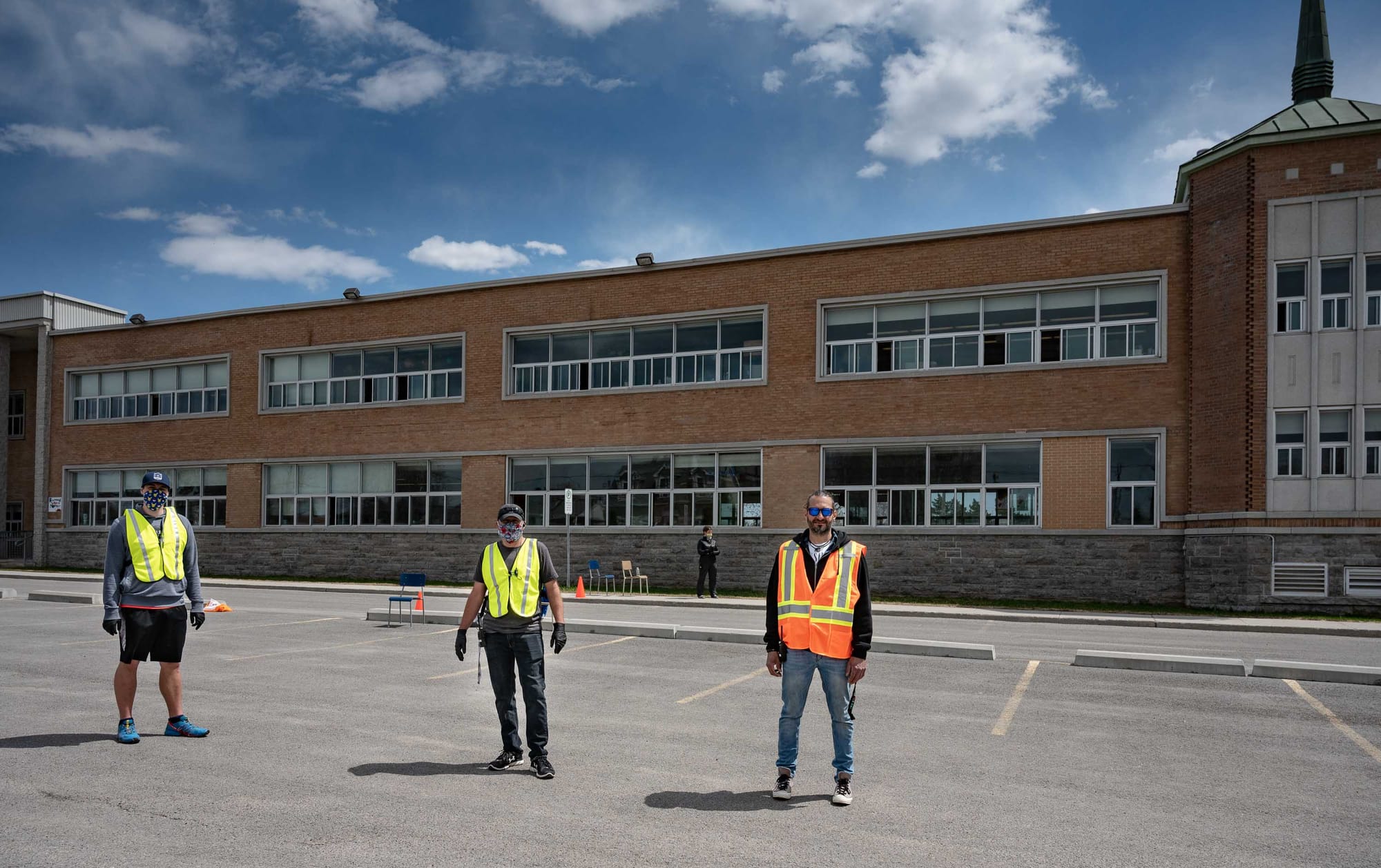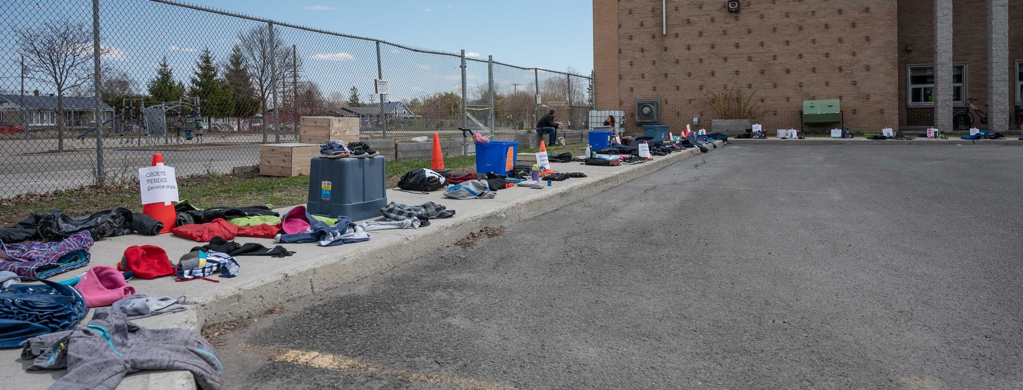 Le service à l'auto était ouvert le jeudi 7 mai à l'École Sainte-Thérèse-de-l'Enfant-Jésus. Les parents des enfants qui ont choisi de ne pas retourner en classe passaient prendre le contenu des casiers de leur enfant.Comme dans toute école, les objets non identifiés sont assez nombreux. Cet imposant étalage de tuques, de bas, de souliers, de sacs, de bouteilles d'eau et de pantalons d'hiver non-réclamés était regroupé selon les locaux et les profs titulaires.Le contenu des casiers était livré « sans contact » à partir d'une fenêtre de la grande salle convertie en guichet pour l'occasion. Les enseignants Jean-Simon Gohier, Bernard Côté et Dominique Boivin se chargeaient de l'opération.Presqu'un train fantôme. Mëme s'il se trouve peu de gens sur la piste cyclable, il ne s'en trouve pas beaucoup plus dans le train de banlieue, dont le stationnement est quasi vide depuis le début de la grande pause du Québec. Le faible coût de l'essence? Le faible achalandage routier? La crainte de prendre le transport en commun?Un brin de nostagie pour les soirées en plein air sur la Place des festivités à Saint-Jérôme. Cette photo date évidemment de 2019. Tous les événements de l'été 2020 sont annulés.