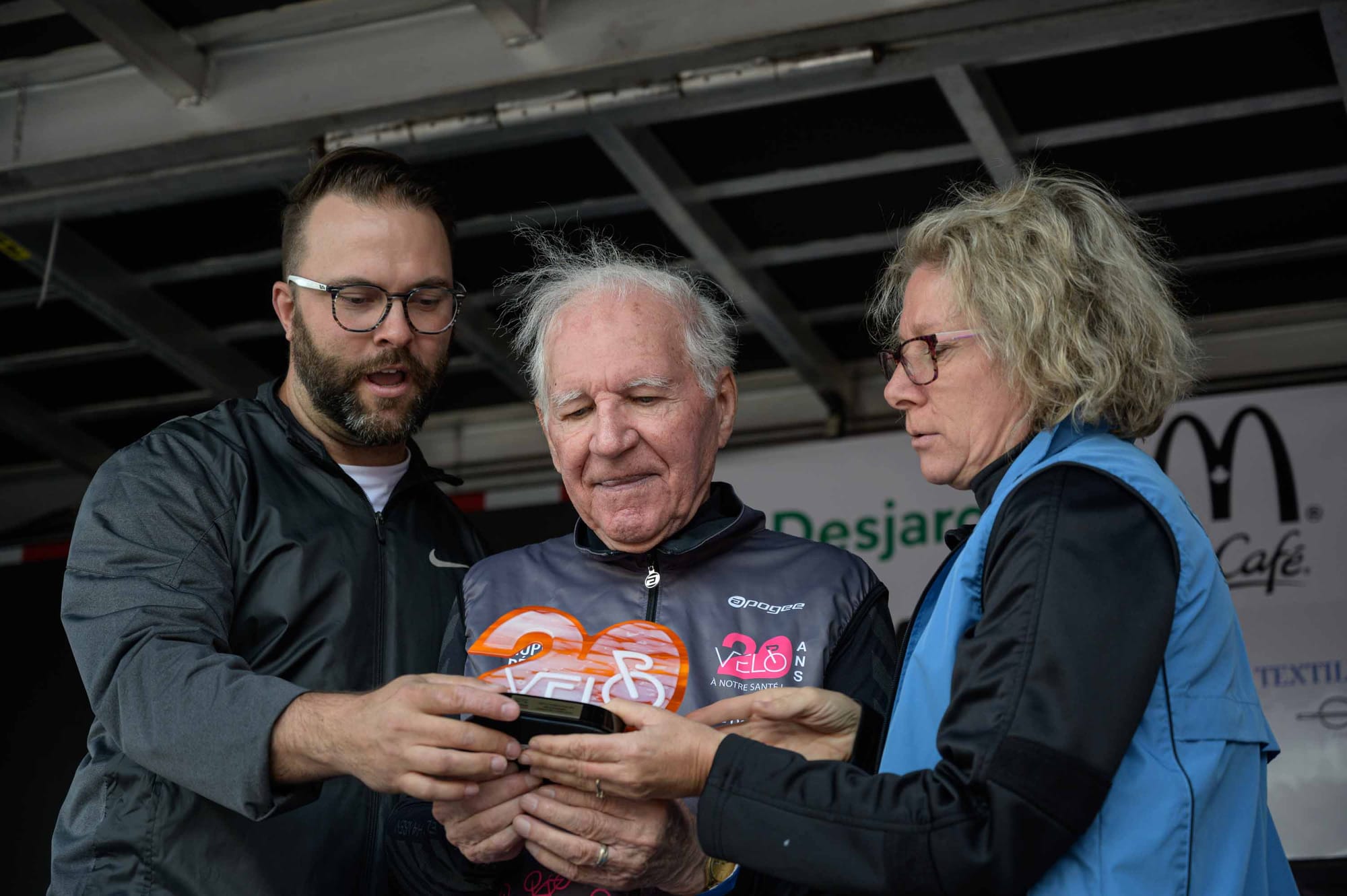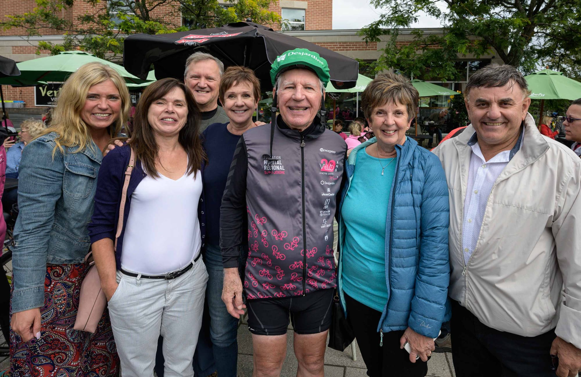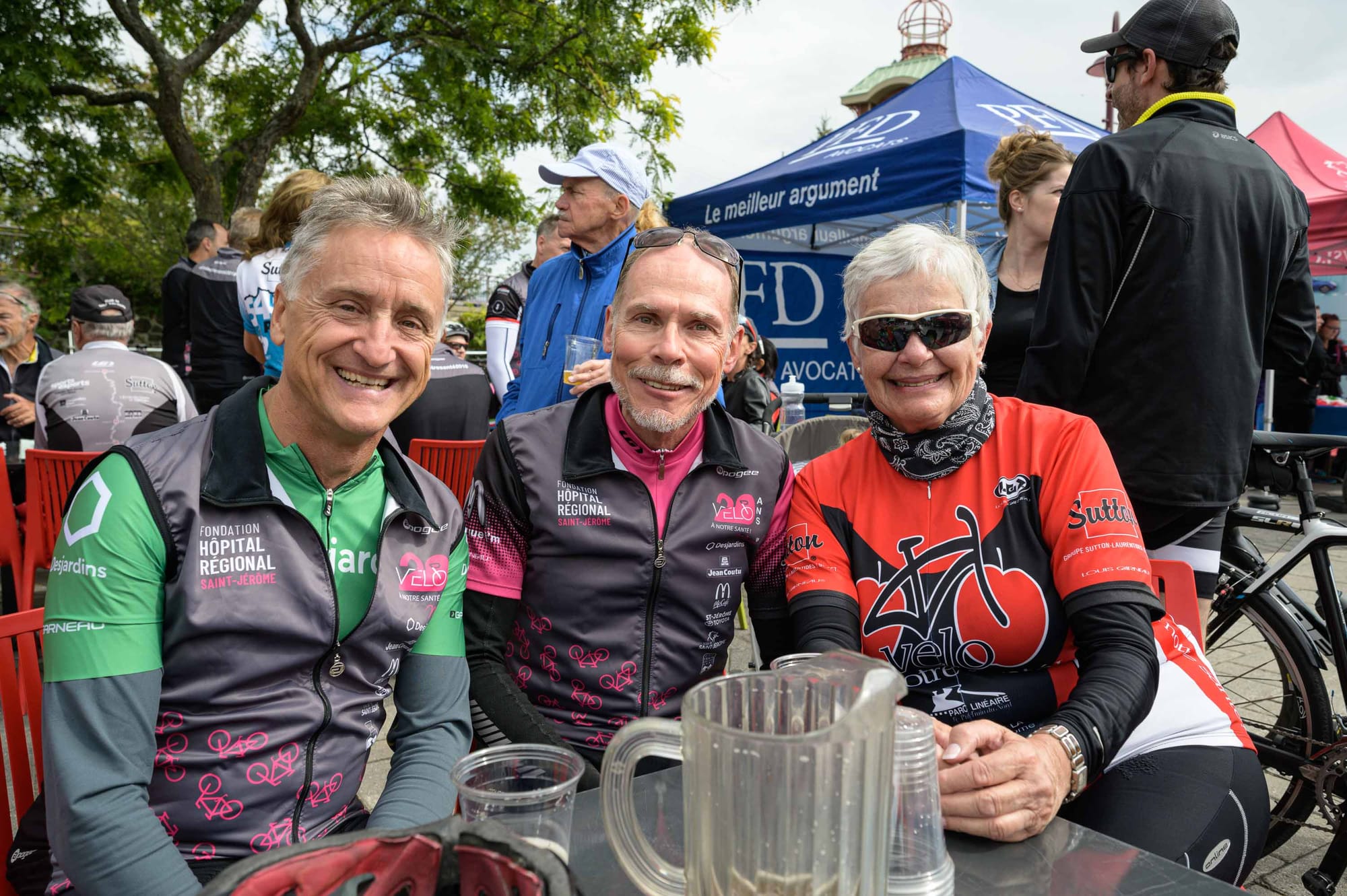 Les environs de la Vieille Gare de Saint-Jérôme ont été envahis par les plus de 700 cyclistes qui ont pris part à Vélo à notre santé.Le trophée de l'équipe la plus nombreuse et celui de l'équipe ayant amassé le plus de dons est allé à l'équipe des PJC Jean Coutu avec 13 267$.L'équipe les 3B a remporté la palme du don le plus élevé recueilli par participant avec une somme de 3715$ pour 6 participants.À 88 ans, Germain Leclair a annoncé qu'il prenait sa retraite de Vélo à notre santé. N'empêche, il a, encore cette année, reçu le trophée de la plus importante cueillette de fonds, avec 11 889$ recueillis aamassés à lui seul uprès de 126 donateurs. On le voit ici en compagnie de Maxime Arcand du CA de la fondation et de la DG Chantale Fortin.Chantale Fortin, directrice de la Fondation de l'Hôpital régional de Saint-Jérôme, a tenu à saluer le 20e anniversaire de l'événement, et la présence de celle qui a lancé l'événement « Vélo à notre santé » alors qu'elle était directrice de la fondation, Aline Desjardins. Comme elle le fait fidèlement depuis 20 ans, Aline Desjardins pédalait encore cette année.Jean-Sébastien Thibault, directeur général de la Corporation du Parc linéaire Le P'tit Train du Nord, n'a pas manqué de rappeler aux cyclistes de profiter pleinement de «leur» parc linéaire de 232 kilomètres. « Un des dix plus beaux au monde », a-t-il souligné.Des fidèles participants, depuis les débuts, on reconnaît Claude Le Bourdais, Robert Charland et Aline Desjardins.À 88 ans, Germain Leclair (au centre) est non seulement un participant fidèle à la randonnée de vélo, mais il continue, bon an mal an, de mener le peloton pour la cueillette de dons. Il est entouré ici de membres de sa famille, dont Danielle Leclair, Mariette Leclair, Daniel Dionne, et Hèléne Leclair, de même que Francine Benoit et Réjean Benoit.On s'occupait de divertir les jeunes au kiosque de Desjardins, un commanditaire de longue date.La SAAQ participait à la journée et faisait un rappel de sécurité avec un camion illustrant pour les cyclistes les angles morts des conducteurs de camions.