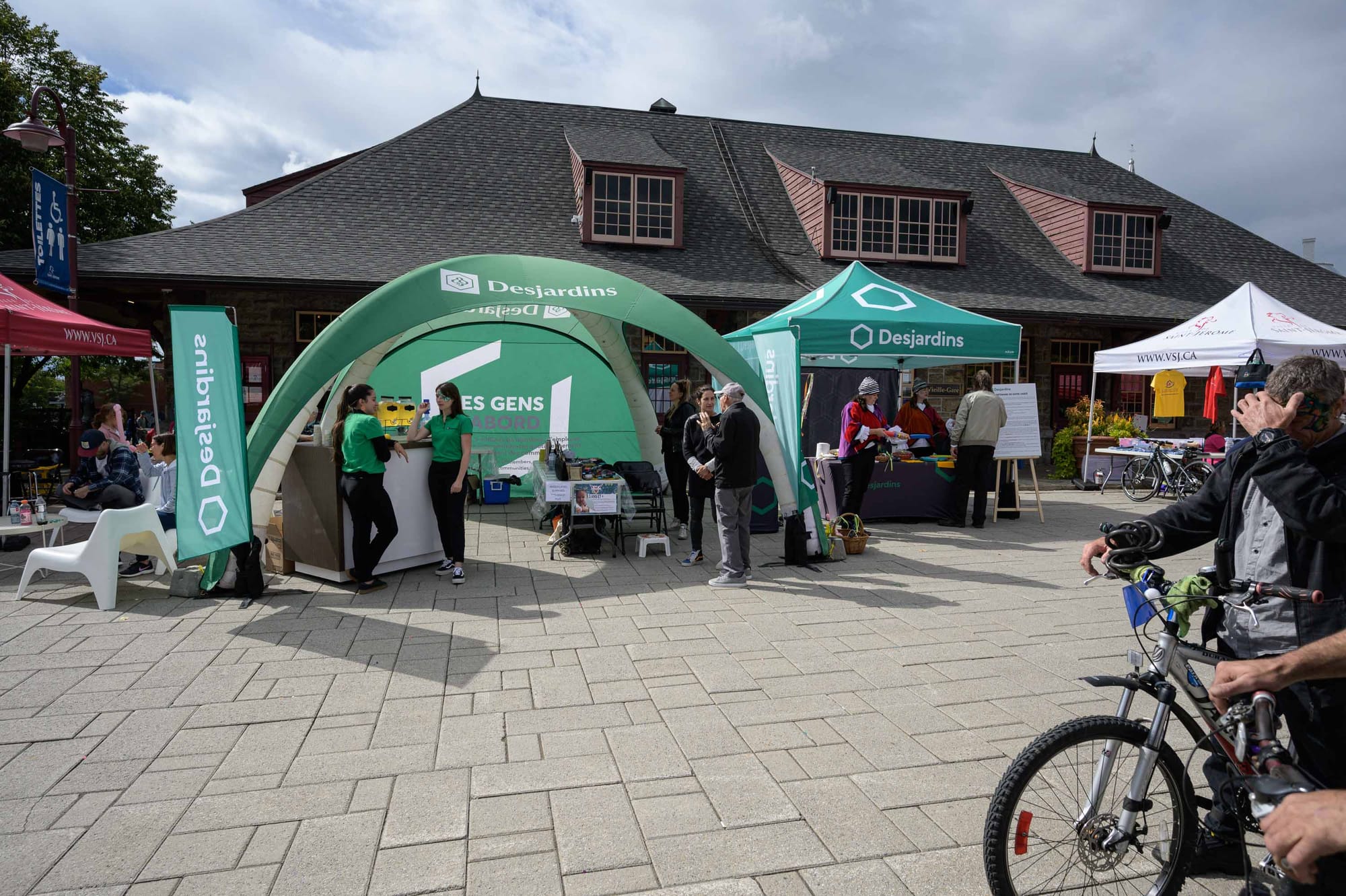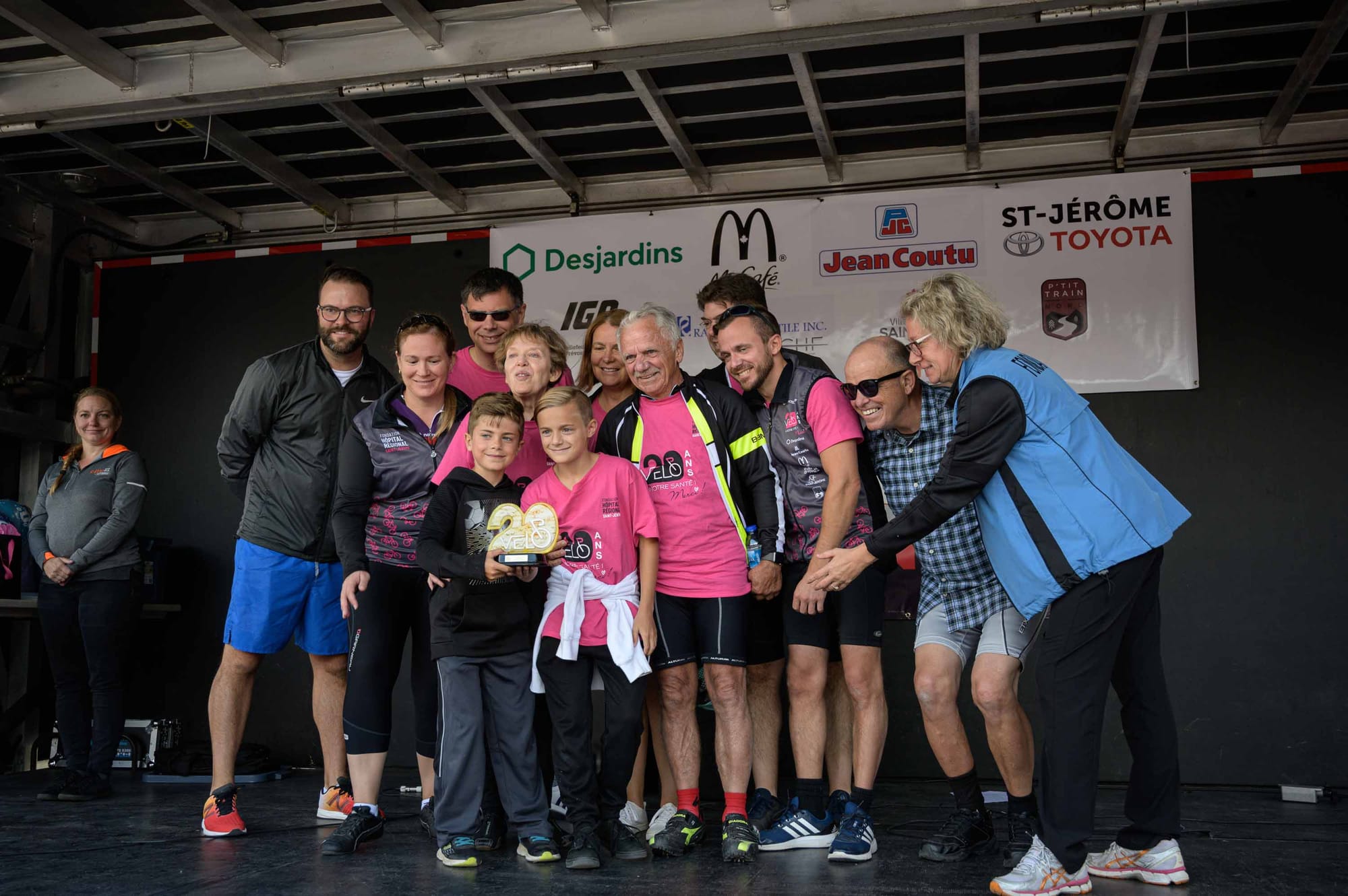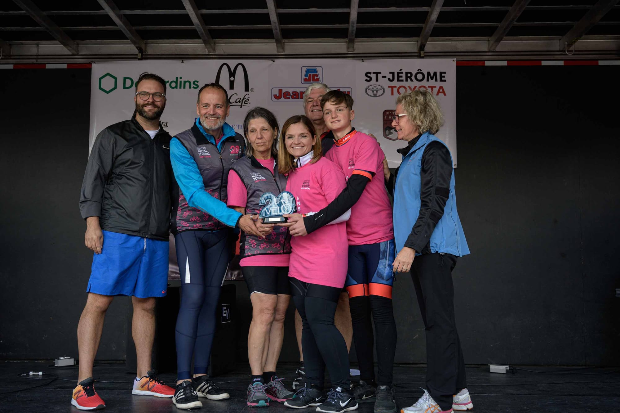Les environs de la Vieille Gare de Saint-Jérôme ont été envahis par les plus de 700 cyclistes qui ont pris part à Vélo à notre santé.Le trophée de l'équipe la plus nombreuse et celui de l'équipe ayant amassé le plus de dons est allé à l'équipe des PJC Jean Coutu avec 13 267$.L'équipe les 3B a remporté la palme du don le plus élevé recueilli par participant avec une somme de 3715$ pour 6 participants.À 88 ans, Germain Leclair a annoncé qu'il prenait sa retraite de Vélo à notre santé. N'empêche, il a, encore cette année, reçu le trophée de la plus importante cueillette de fonds, avec 11 889$ recueillis aamassés à lui seul uprès de 126 donateurs. On le voit ici en compagnie de Maxime Arcand du CA de la fondation et de la DG Chantale Fortin.Chantale Fortin, directrice de la Fondation de l'Hôpital régional de Saint-Jérôme, a tenu à saluer le 20e anniversaire de l'événement, et la présence de celle qui a lancé l'événement « Vélo à notre santé » alors qu'elle était directrice de la fondation, Aline Desjardins. Comme elle le fait fidèlement depuis 20 ans, Aline Desjardins pédalait encore cette année.Jean-Sébastien Thibault, directeur général de la Corporation du Parc linéaire Le P'tit Train du Nord, n'a pas manqué de rappeler aux cyclistes de profiter pleinement de «leur» parc linéaire de 232 kilomètres. « Un des dix plus beaux au monde », a-t-il souligné.Des fidèles participants, depuis les débuts, on reconnaît Claude Le Bourdais, Robert Charland et Aline Desjardins.À 88 ans, Germain Leclair (au centre) est non seulement un participant fidèle à la randonnée de vélo, mais il continue, bon an mal an, de mener le peloton pour la cueillette de dons. Il est entouré ici de membres de sa famille, dont Danielle Leclair, Mariette Leclair, Daniel Dionne, et Hèléne Leclair, de même que Francine Benoit et Réjean Benoit.On s'occupait de divertir les jeunes au kiosque de Desjardins, un commanditaire de longue date.La SAAQ participait à la journée et faisait un rappel de sécurité avec un camion illustrant pour les cyclistes les angles morts des conducteurs de camions.