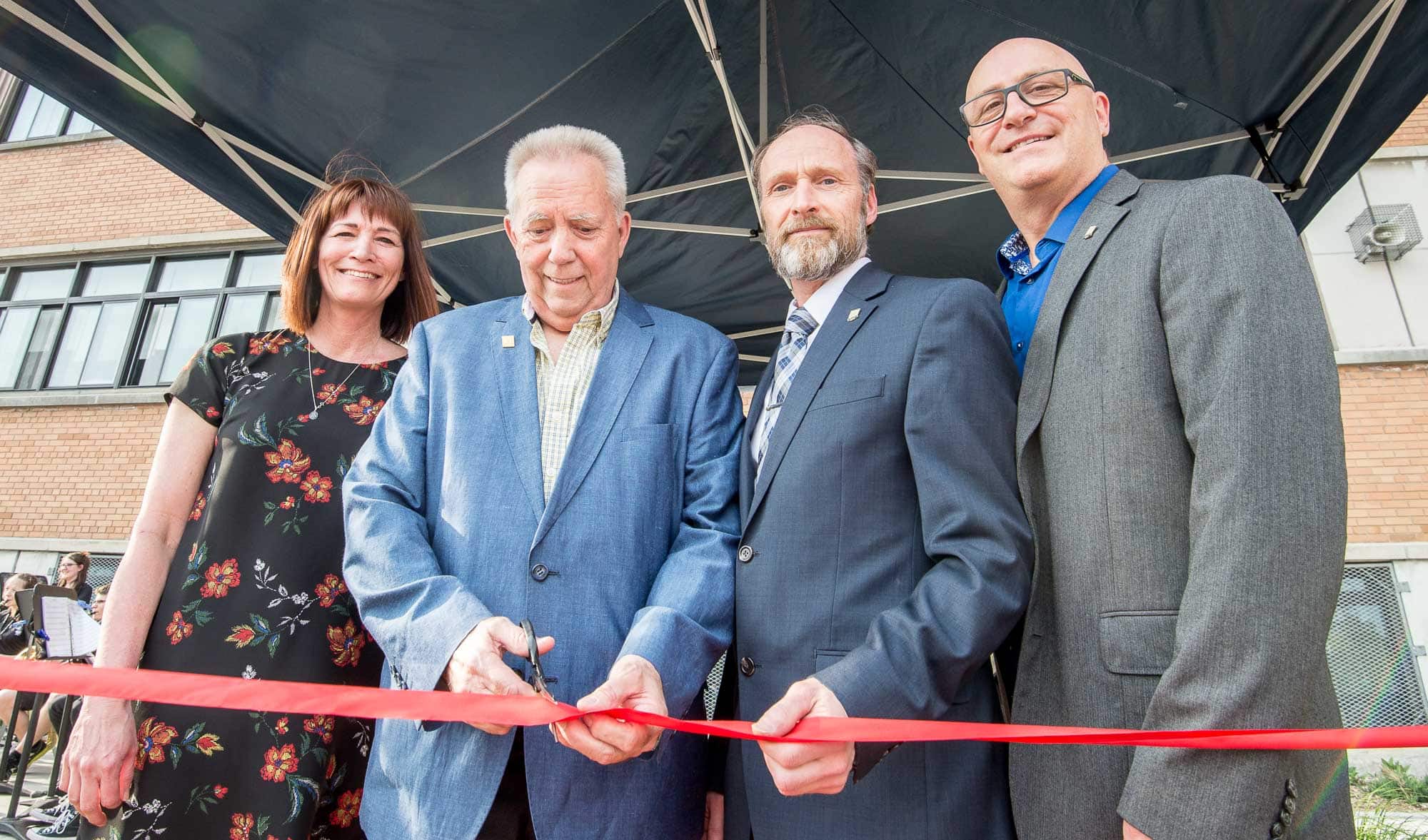 Pour la coupure officielle du ruban, on retrouve Pauline Cyr, directrice adjointe, le président du Conseil des commissaires de la Commission scolaire de la Rivière-du-Nord, Jean-Pierre Joubert, le directeur de l'École Frenette Richard Jourdain et Richard Marchildon, directeur adjoint.