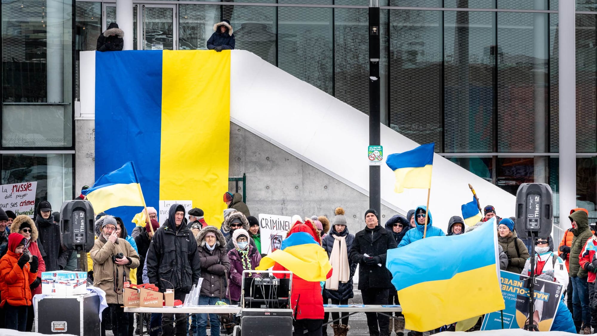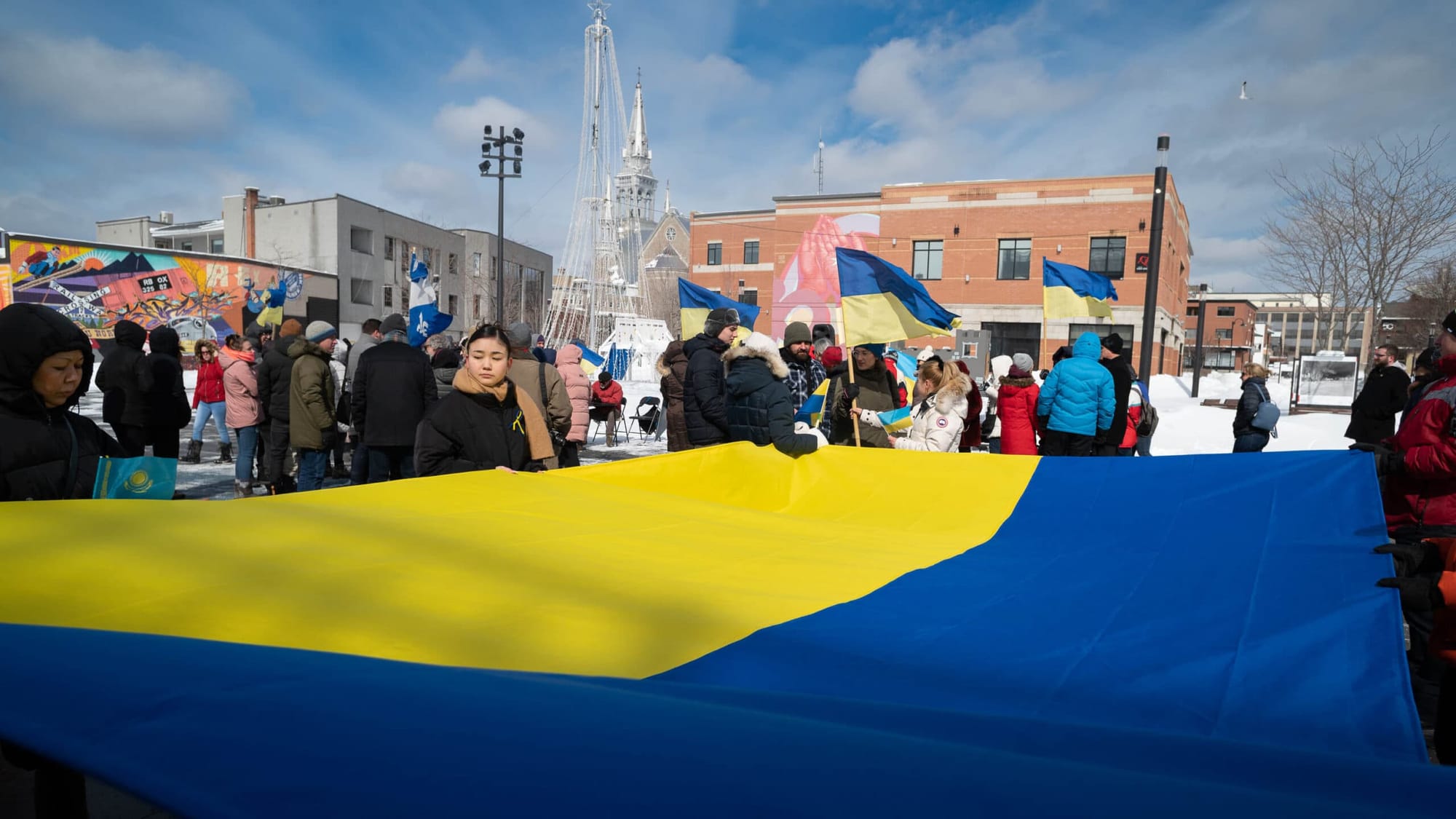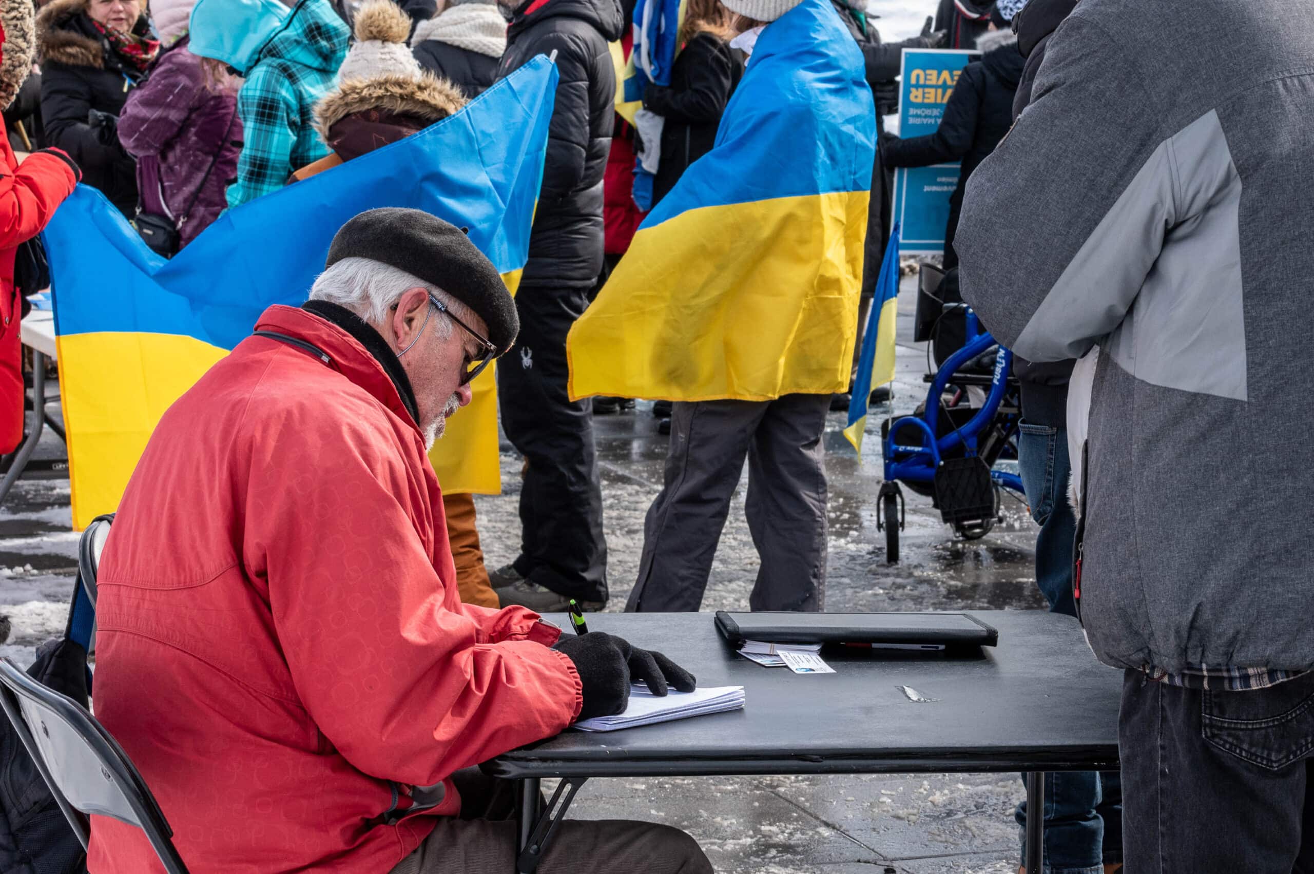 Elle s'exprime aussi par ces gens qui entouraient un grand drapeau ukrainien devant la façade du Théâtre Gilles-Vigneault. Elle s'exprime par la présence d'un peu plus d'une centaine de personnes qui se sont regroupées par un dimanche midi froid et venteux du mois de mars pour simplement se tenir debout et manifester leur solidarité avec le peuple ukrainien. Elle s'exprime par un silence ému et respectueux à l'écoute d'un hymne national étranger qui a momentanément rempli l'espace public.