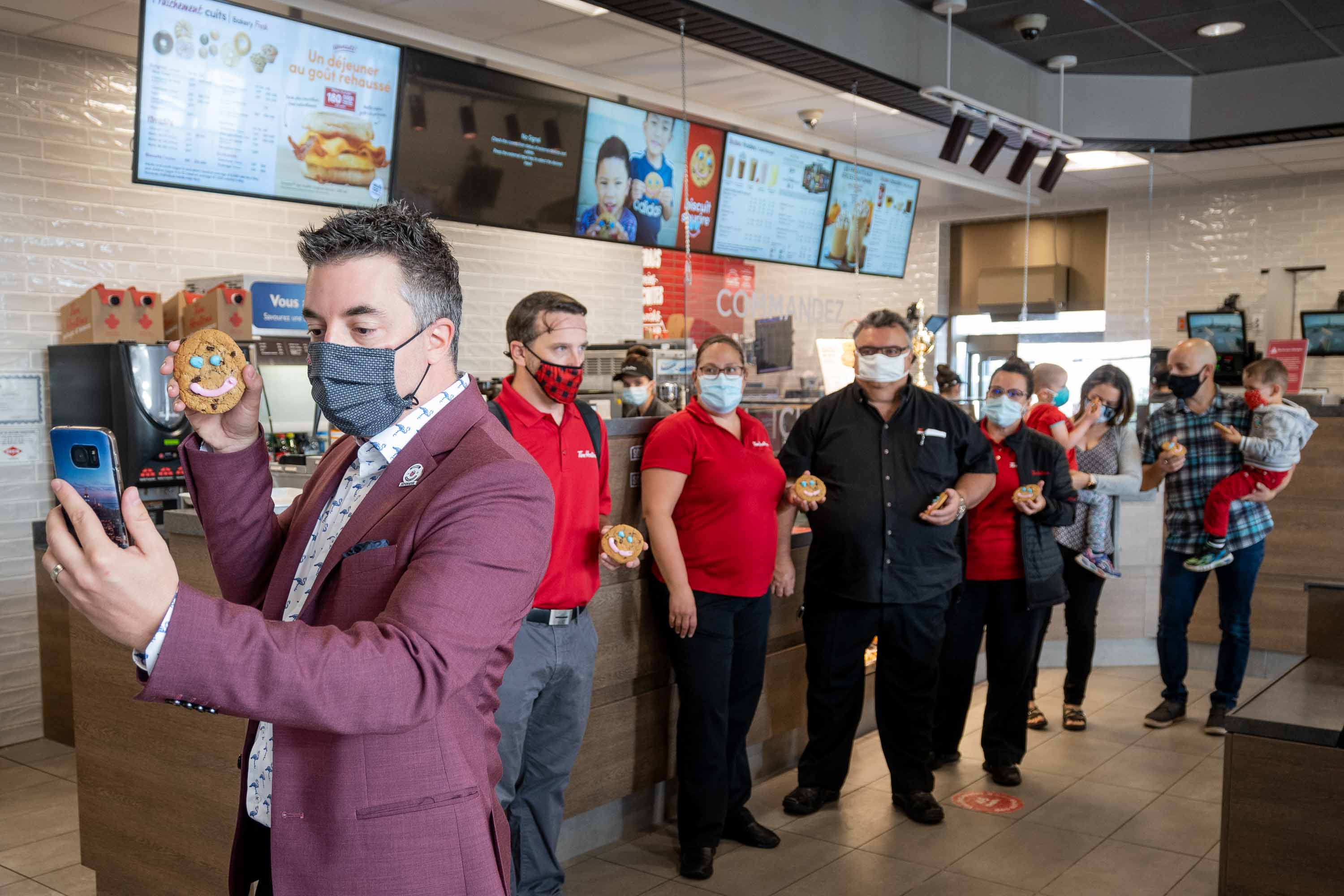 Les biscuits aux brisures de chocolat ne prennent que quelques secondes de plus chacun à fabriquer et on nous a assurés qu'il n'avait pas été question de cacher les sourires par un masque en cette année de pandémie.