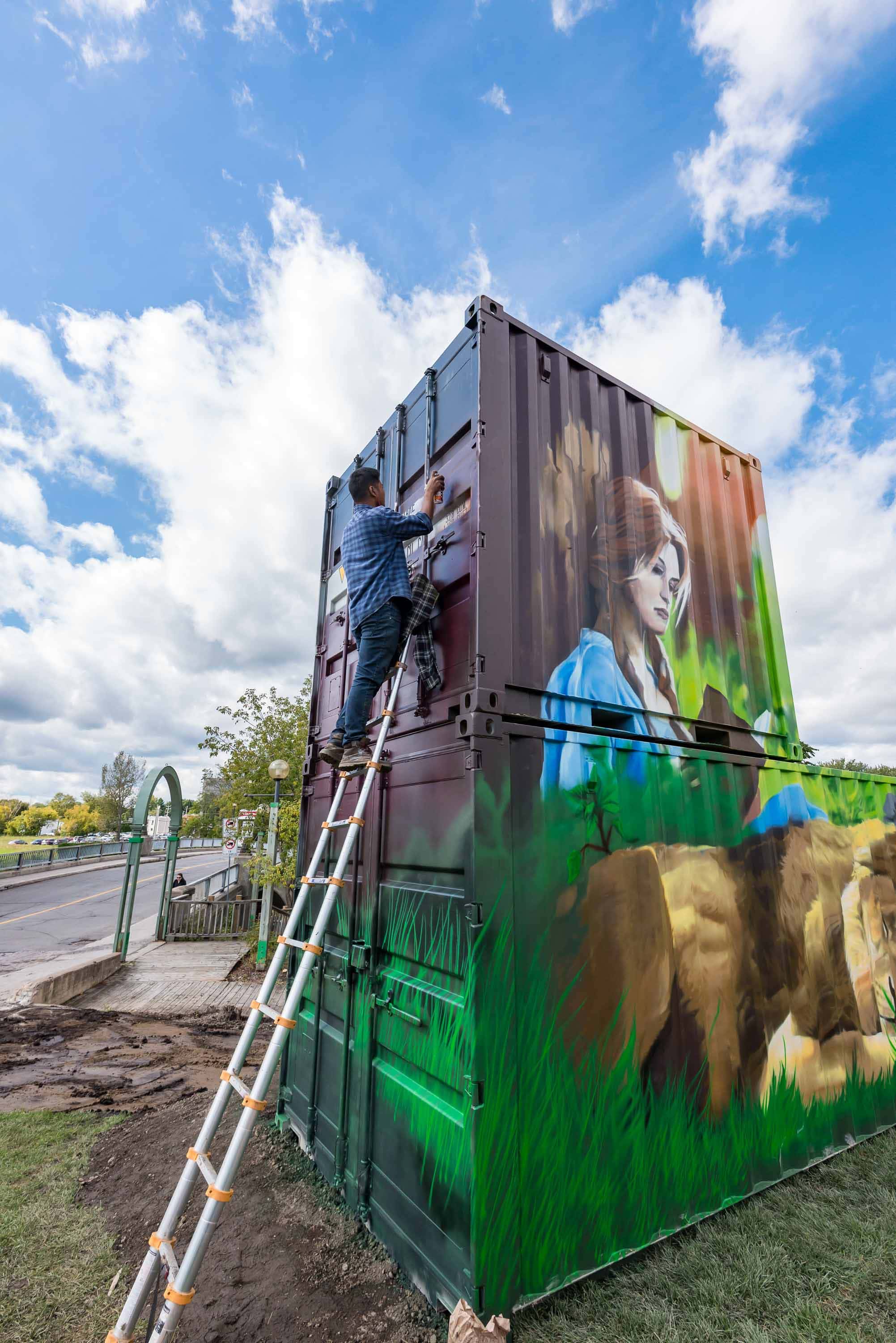 La plus récente est signée par Rouks One et a été réalisée sur un assemblage de conteneurs installé à l'angle des rues Labelle et Castonguay, là où la Ville de Saint-Jérôme projette depuis deux ans le développement de jardins urbains.