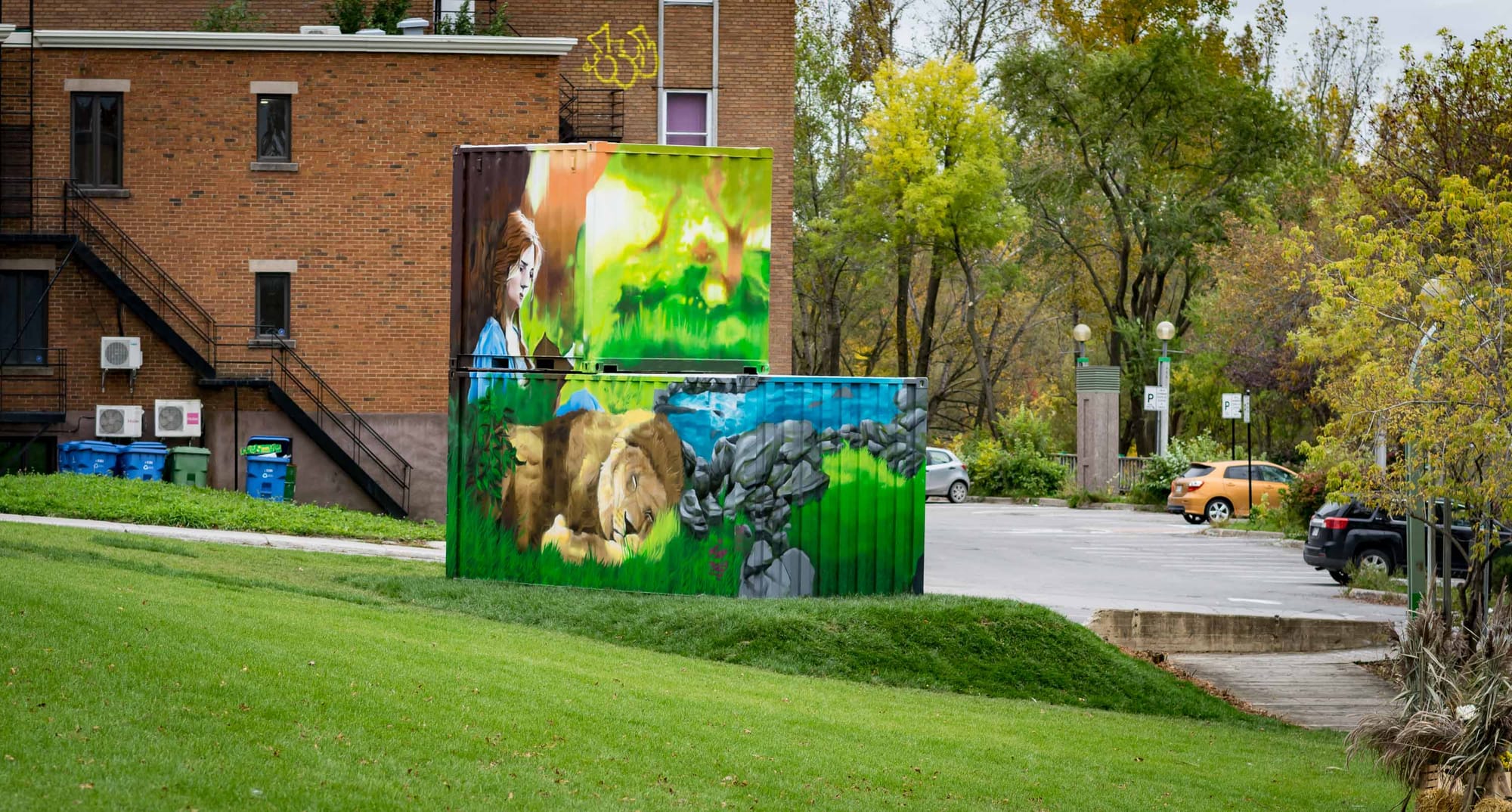 Quant au tableau à l'angle des rues Labelle et Castonguay, on y trouve une lectrice, un musicien, et un lion couché dans l'herbe. Une traduction plutôt littérale du Quartier des arts et du savoir dans une ville dont le logo comporte un lion.