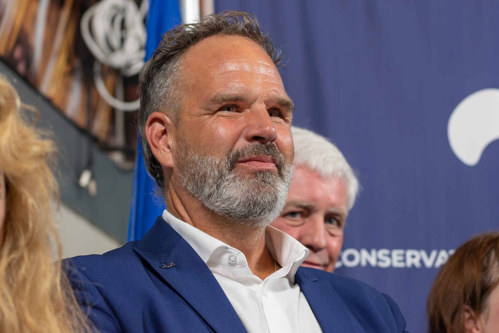 Au premier plan, la comédienne et candidate conservatrice Anne Casabonne ainsi que le candidat dans Saint-Jérôme, Maxime Clermont.