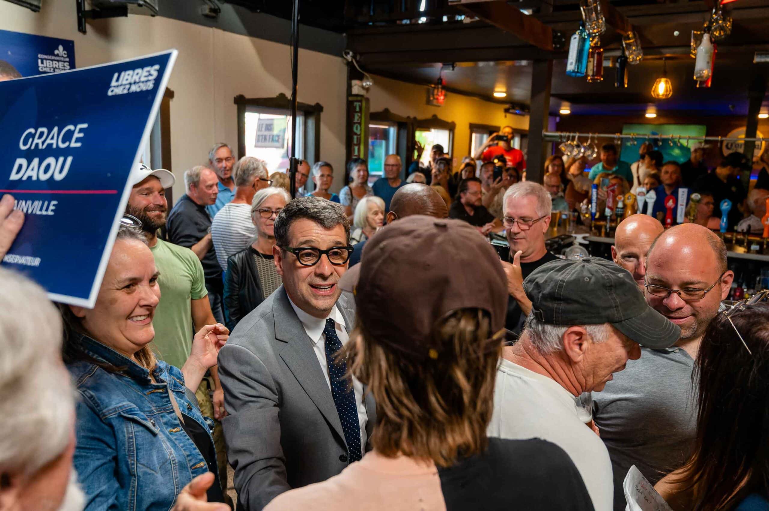 Le chef conservateur Éric Duhaime était de passage à Saint-Jérôme le vendredi 2 septembre devant un auditoire qu'il a lui-même qualifié de « survolté, » et dont il a atiisé l'enthousiasme avec vigueur et conviction. Duhaime était accompagné d'une quinzaine de candidats de son parti et de leur suite, ce qui a largement suffi à remplir le rez-de-chaussée du bar du centre-ville où la rencontre a eu lieu.