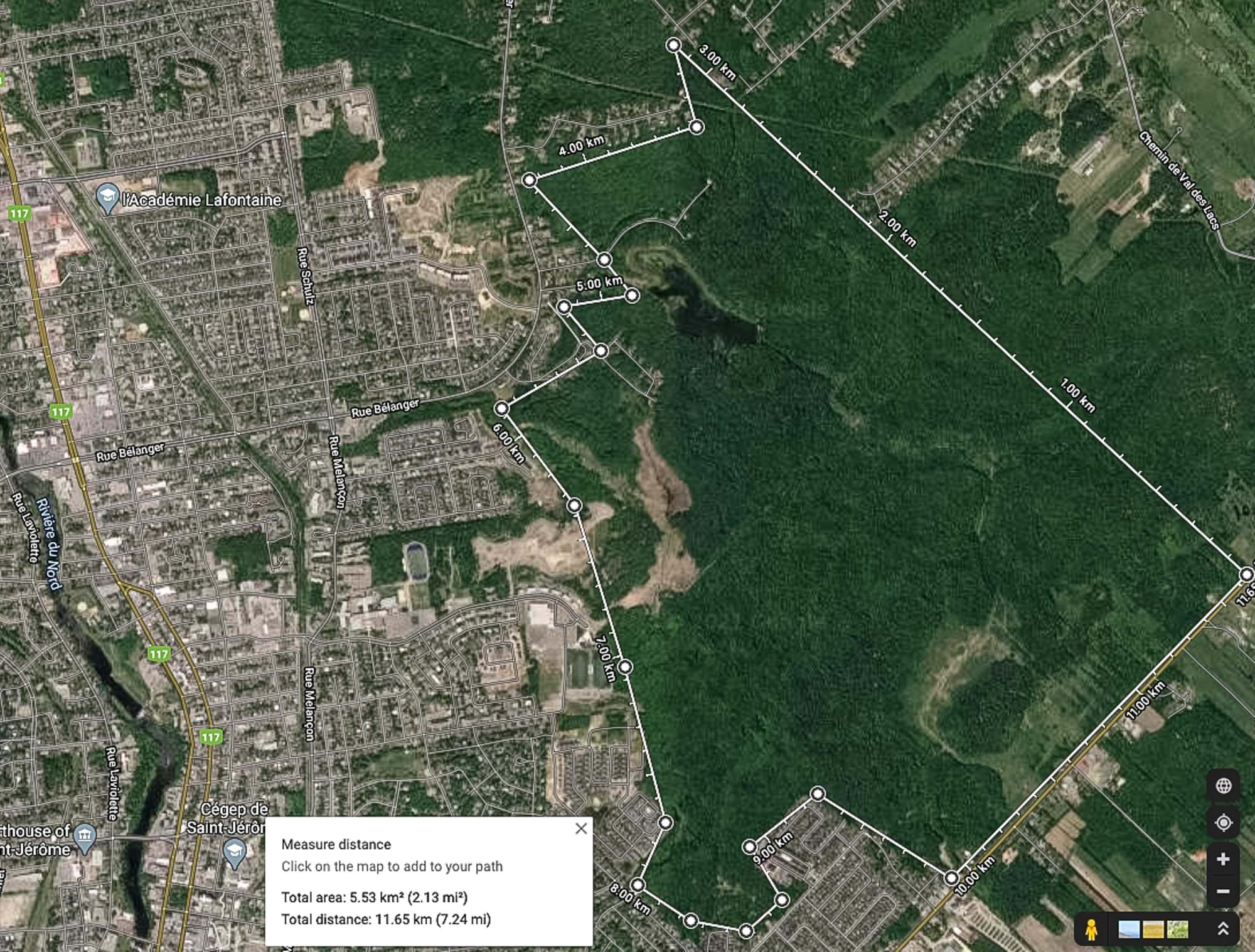 Pourtant, à partir de cet endroit, il faut parcourir deux kilomètres pour arriver sur le terrain du Parc du lac Jérôme. Au fil des phases de développement, il est plus réaliste de songer que ce parcours de deux kilomètres, qui se fait présentement dans un boisé, sera éventuellement une marche à travers des bungalows.