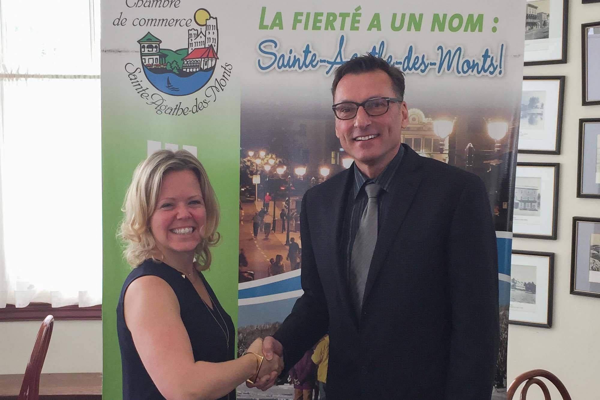 Sur la photo on reconnaît la présidente de la Chambre de commerce de Sainte-Agathe souhaitant la bienvenue à Jean Touchette.