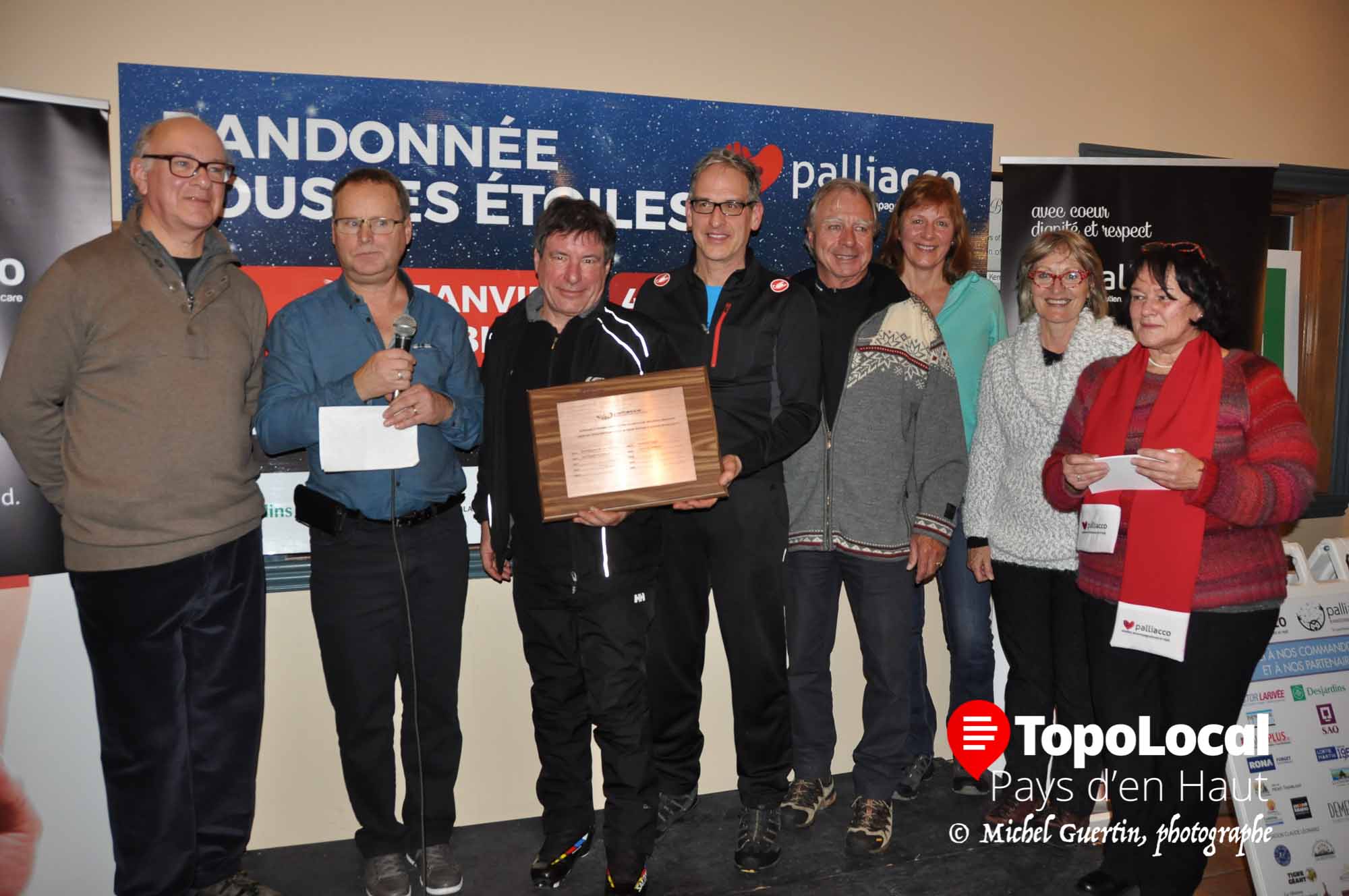 Laurent Paquette, capitaine de Paquette & Co(4585 $) et coprésident d’honneur; Jean Desnoyers, directeur général de Palliacco; François Bertrand et Michel Trottier, président et directeur général de Desjardins Sainte-Agathe de l’équipe gagnante Desjardins; Dr Pierre Pilon, coprésident d’honneur; Francine Laferrière, capitaine de La Voie lactée(2436 $); Louise Lefebvre, capitaine des Coeurs de Palliacco(3410 $) et Aline Robillard, présidente de Palliacco.