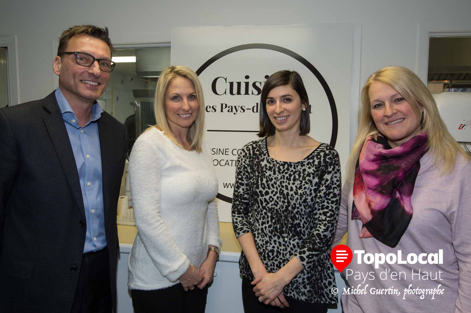 C'est dans la Cuisine des Pays-d'en-Haut que les membres de la Chambre de commerce de Sainte-Agathe se sont réunis pour leur 5 à 7 en entreprise mardi. Cette cuisine professionnelle peut être louée pour les besoins de transformation en cuisine de traiteurs ou d'autres gens de l'alimentation. Catherine Hamé, la jeune propriétaire entrepreneure de ce nouveau concept de location de cuisine, est entourée de Jean Touchette, directeur général de la chambre, de Sonia Giguère et de Nathalie Dion du conseil d'administration.