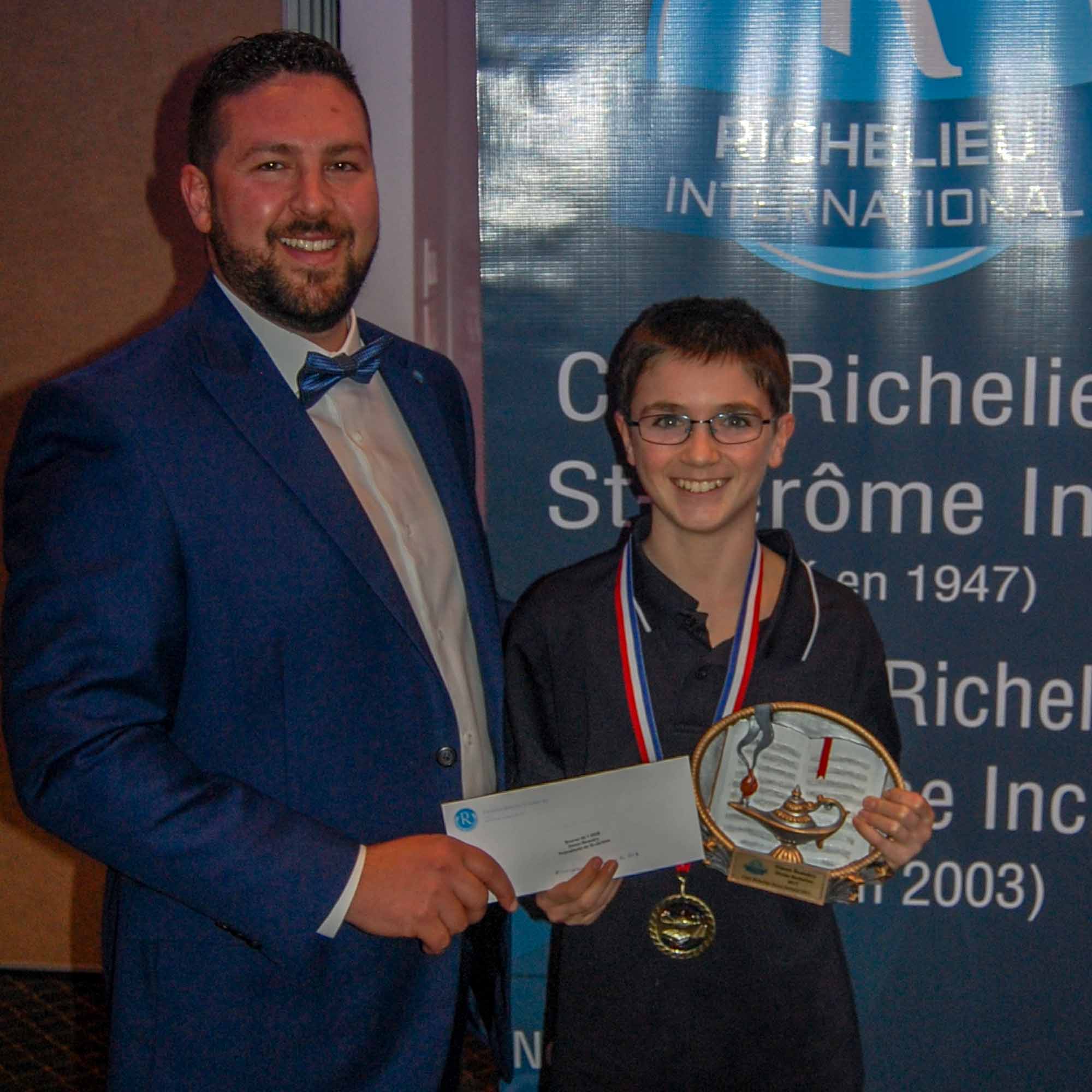 Simon Beaudry reçoit son prix des mains du président du Club Richelieu Saint-Jérôme, Jonathan Bissonnette.