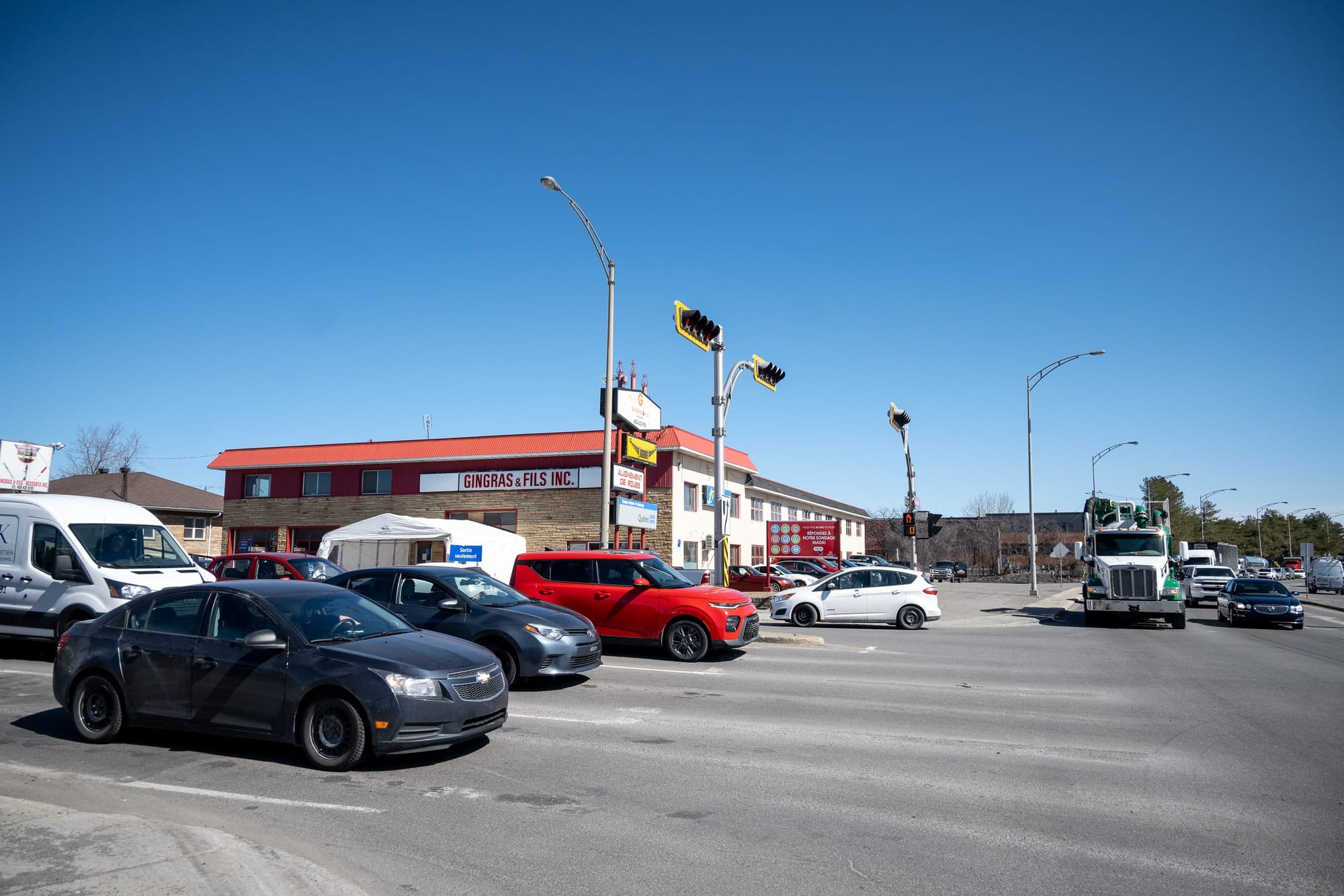 Est-ce que ces voitures tentaient de former une couleuvre d'acier qui avale sa queue? Non. Elles étaient en attente pour passer un test de dépistage de la COVID-19 sans rendez-vous à l'auto.