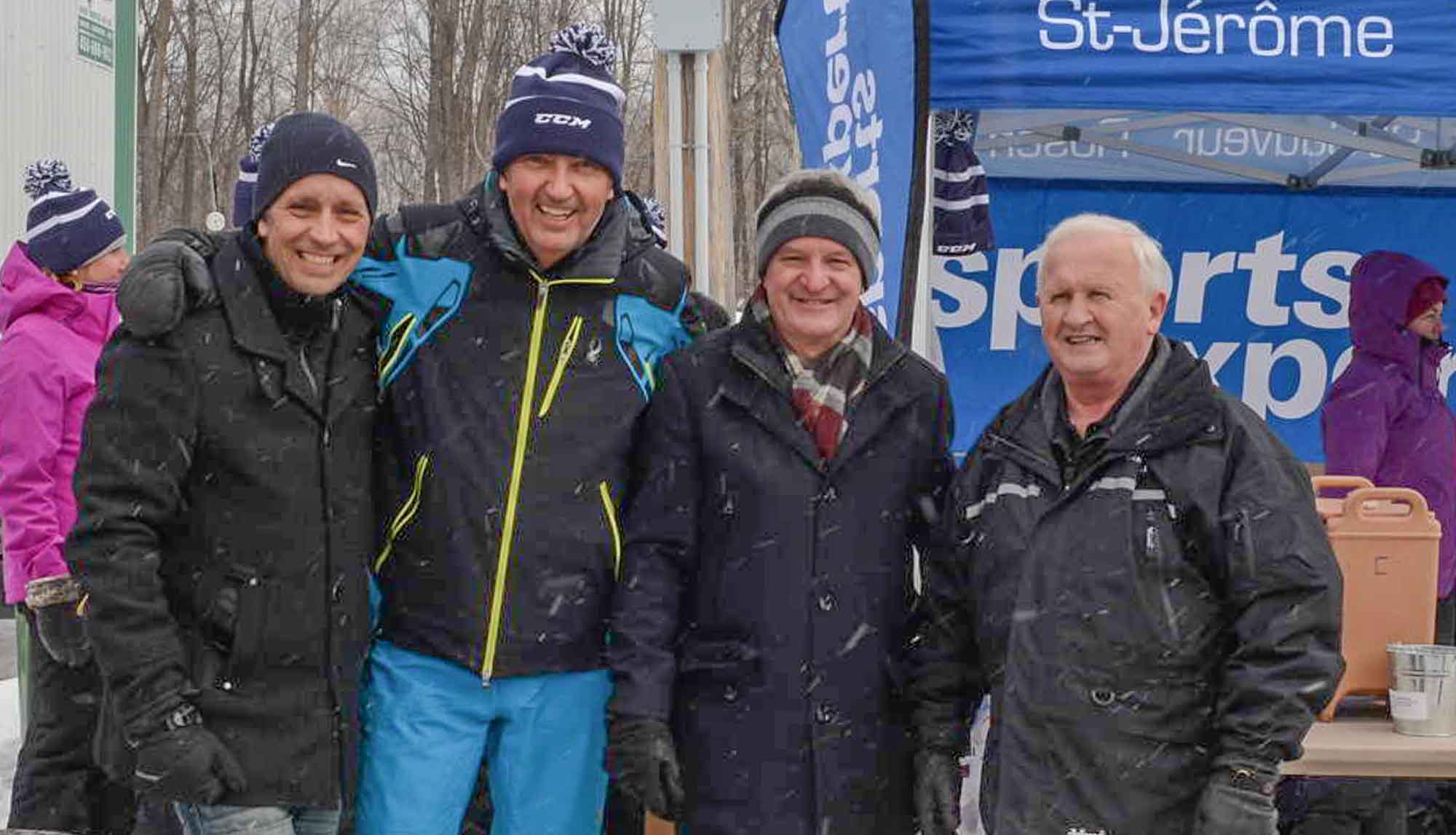 La Ville de Saint-Jérôme appuie la causeLe maire Stéphane Maher ainsi que les conseillers municipaux Gilles Robert et Bernard Bougie entourent l'organisateur Sylvain Rochon.