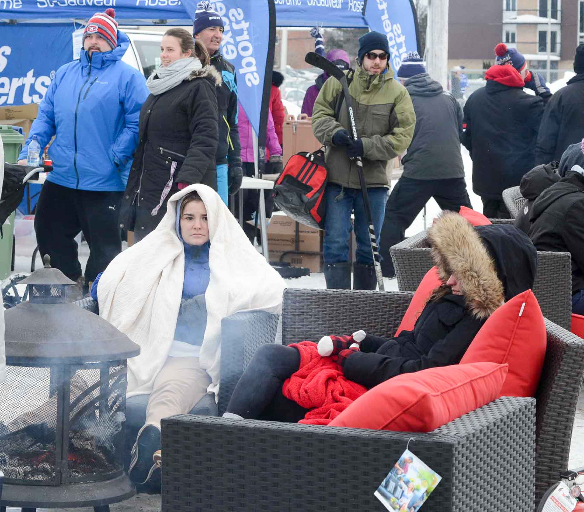 Bien au chaud près du foyerLe lounge était parfaitement positionné devant l’écran géant, déplacé spécialement pour la présentation du match des Canadiens en après-midi. Le comité avait tout prévu afin de faire de cette journée une expérience globale mémorable.
