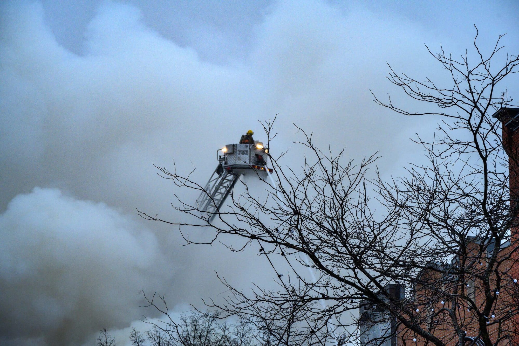 Malgré une pluie légère, la température relativement douce ( environ 1C ) a certainement facilité le travail des nombreux pompiers.