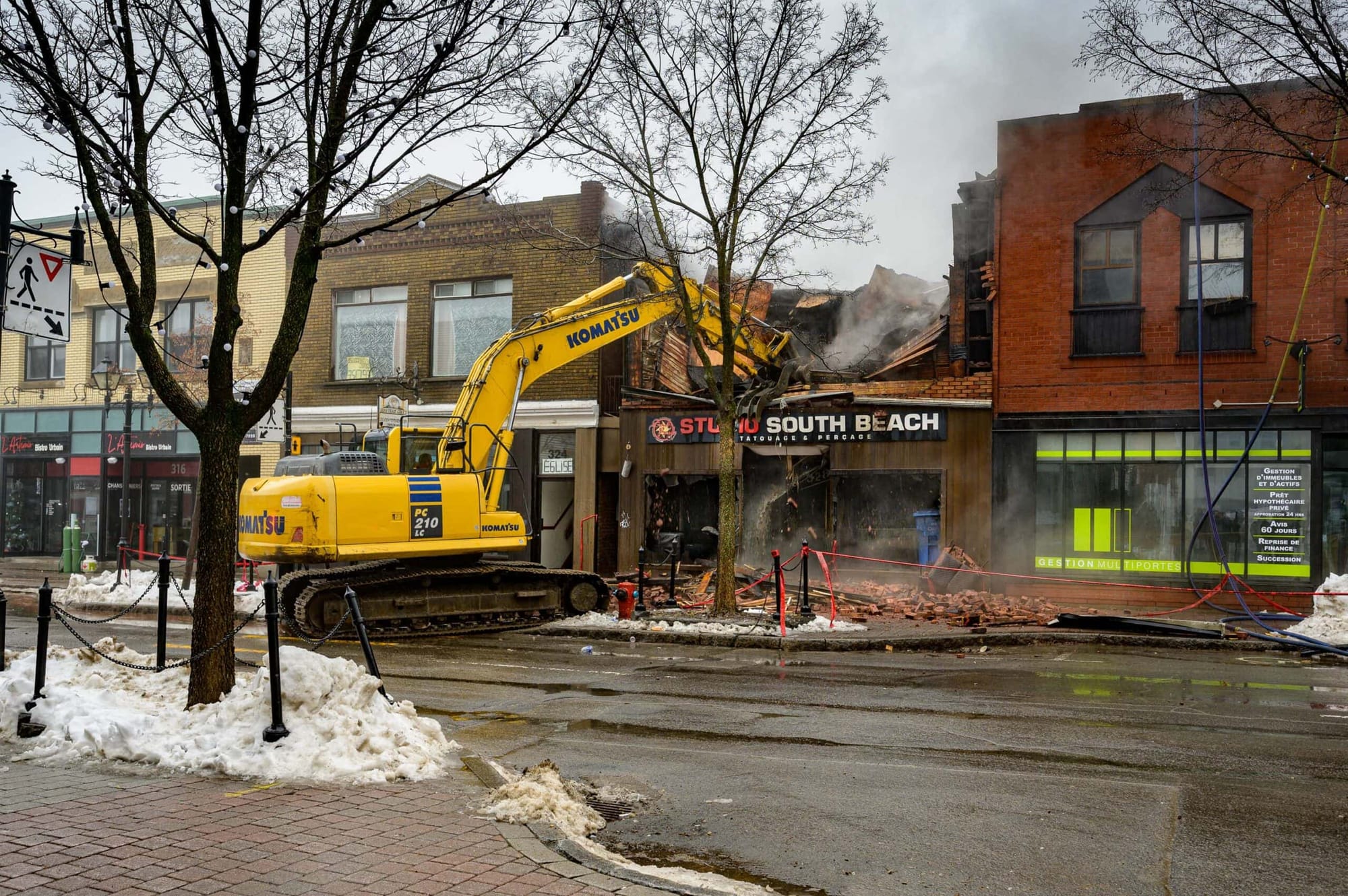 Dans cette partie du centre-ville, plusieurs bâtiments sont connexes et ne sont séparés que par des murs coupe-feu par endroits. En fin de matinée, le foyer de l'incendie semblait contenu à l'édifice du studio de tatouage, et une bijouterie voisine était sous haute surveillance. On peut déjà supposer que quelques structures voisines ont subi des dommages par l'eau et la fumée. Le secteur était encore fermé à la circulation dimanche midi. Il est resté fermé à la circulation jusqu'en fin de journée lundi afin que les enquêteurs puissent faire les expertises requises à la suite de la découverte d'une victime.