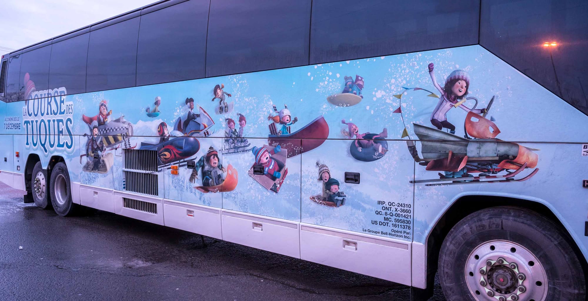 À la porte du cinéma, l'autobus de La course des tuques signalait la présence de la tournée de promotion à Saint-Jérôme. L'autobus est comme le film. il est tapissé de personnages imaginaires, mais rempli de vrais humains.