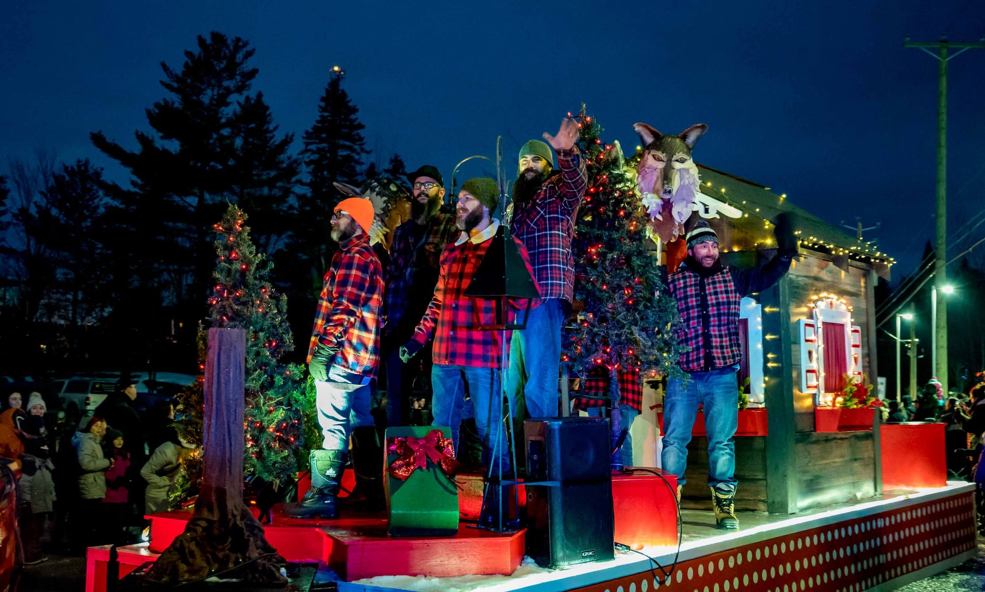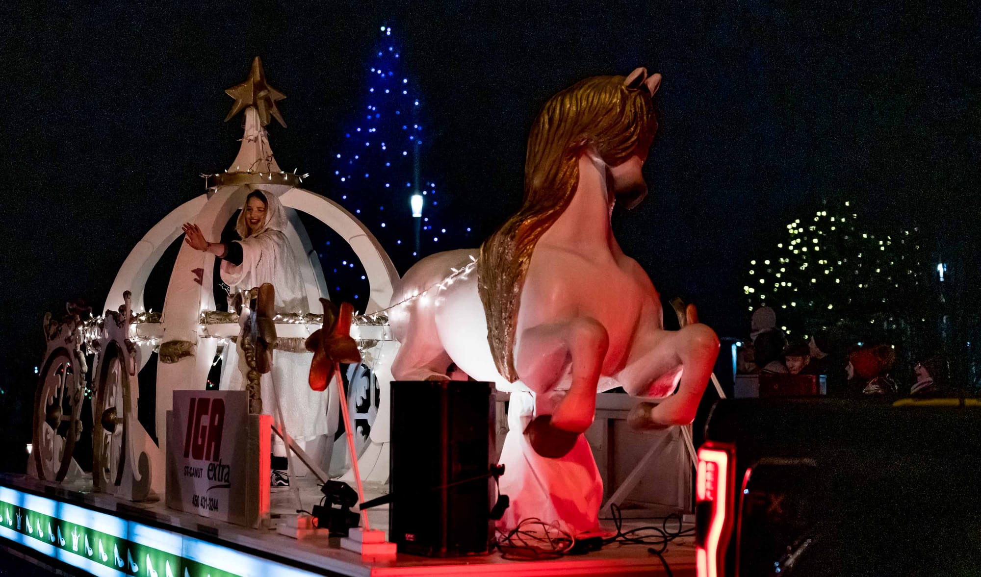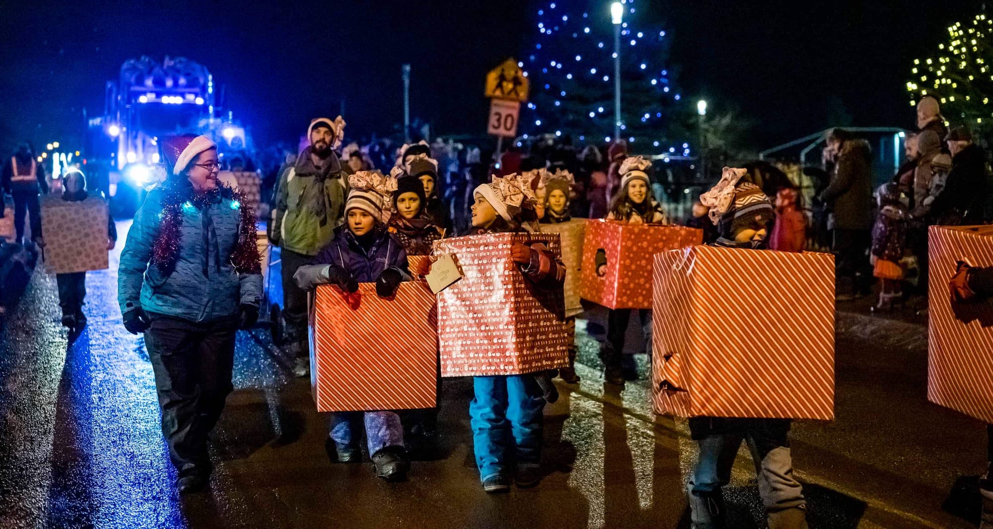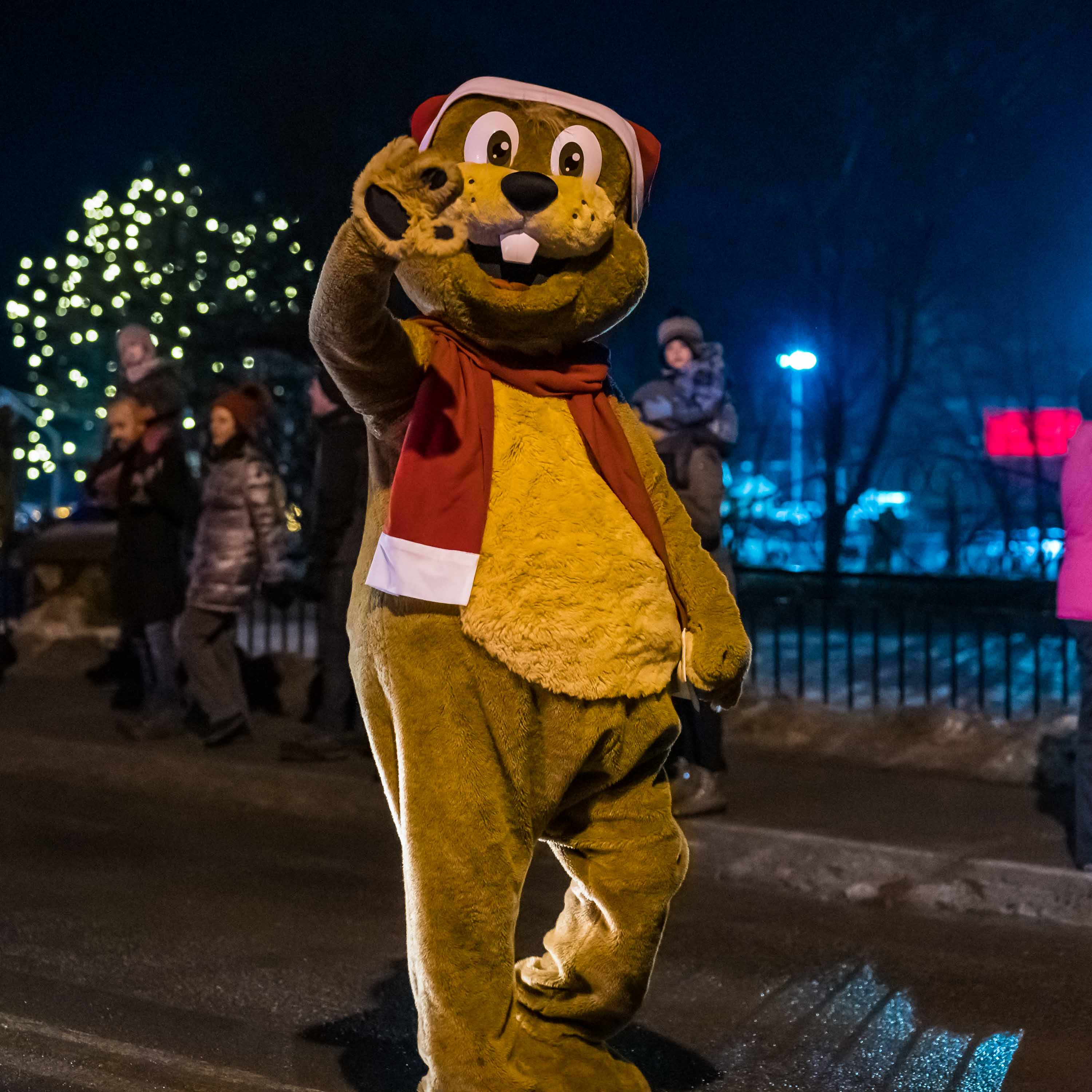 En fait, le coeur du village a été bloqué à toute circulation de 16h30 à 17h30, alors que la rue s'est remplie de musique, de lumières, personnages, de chars allégoriques, et de très nombreux spectateurs. Le beau temps et l'ambiance d'un défilé tenu dans l'obscurité du soleil couhant ont contribué à gonfler l'assistance, remplissant les stationnements et les navettes qui avaient été prévus pour l'occasion.