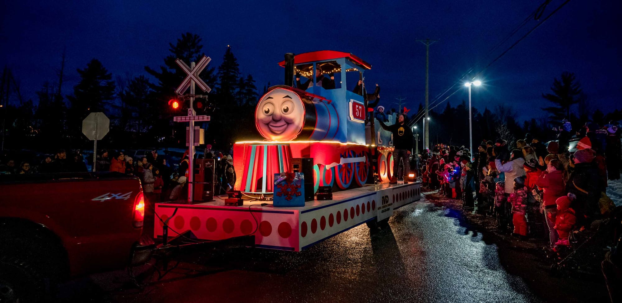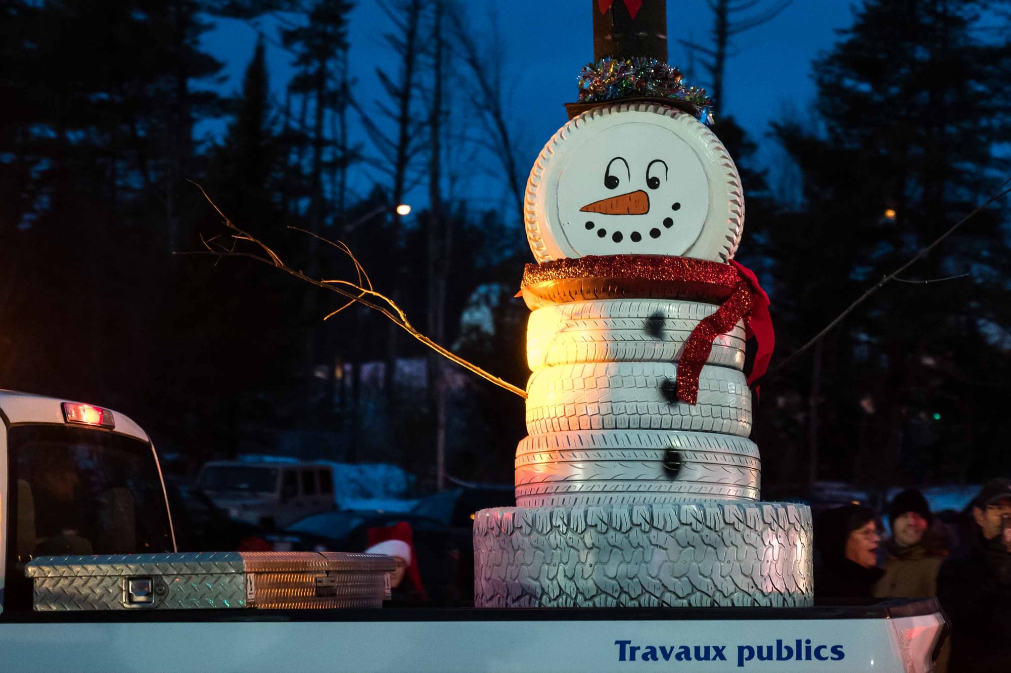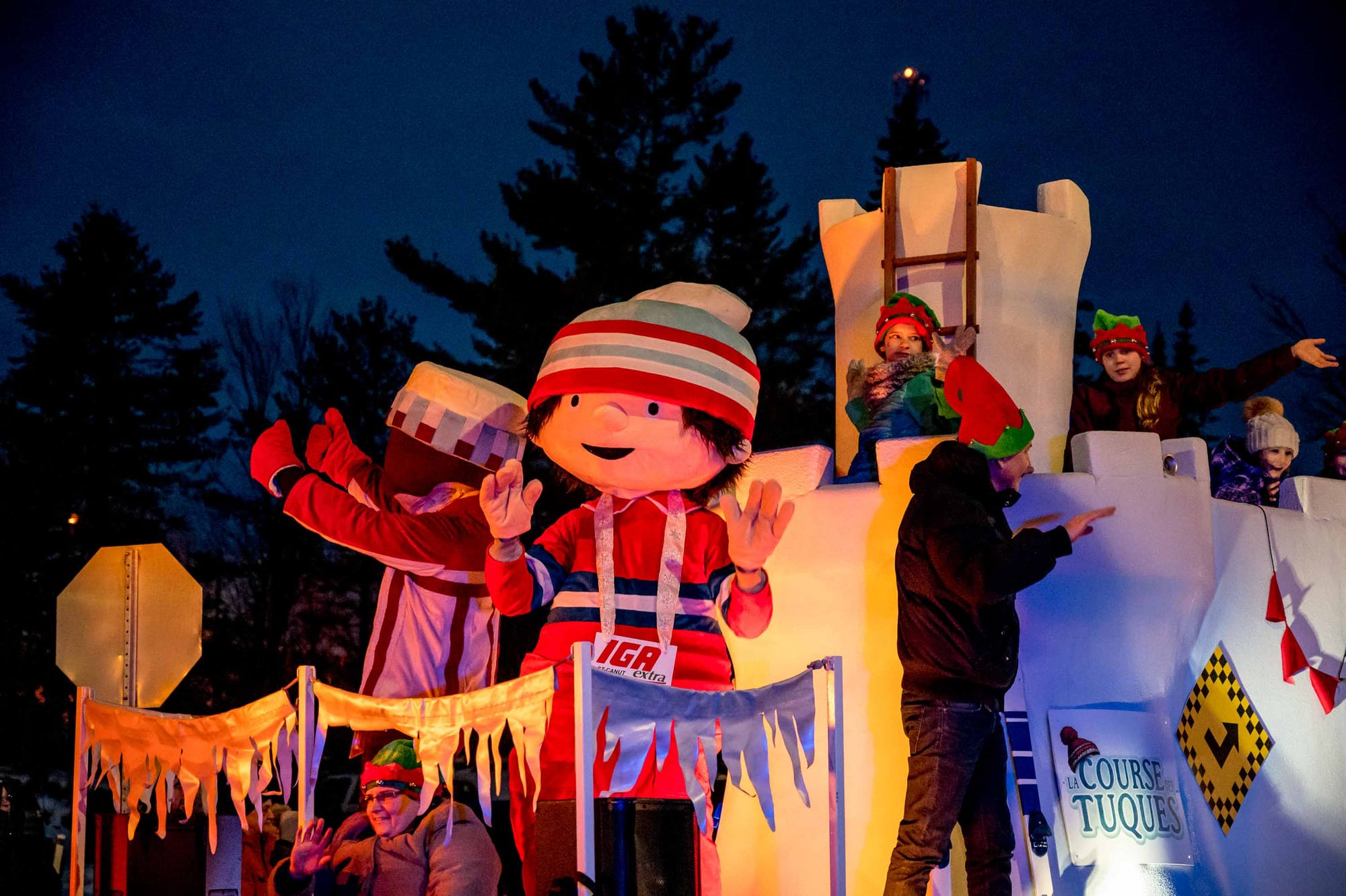 En fait, le coeur du village a été bloqué à toute circulation de 16h30 à 17h30, alors que la rue s'est remplie de musique, de lumières, personnages, de chars allégoriques, et de très nombreux spectateurs. Le beau temps et l'ambiance d'un défilé tenu dans l'obscurité du soleil couhant ont contribué à gonfler l'assistance, remplissant les stationnements et les navettes qui avaient été prévus pour l'occasion.