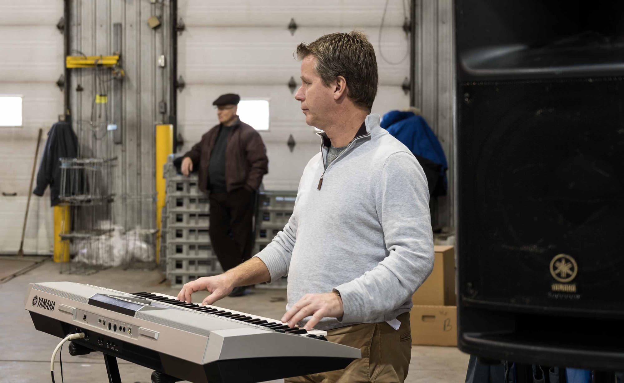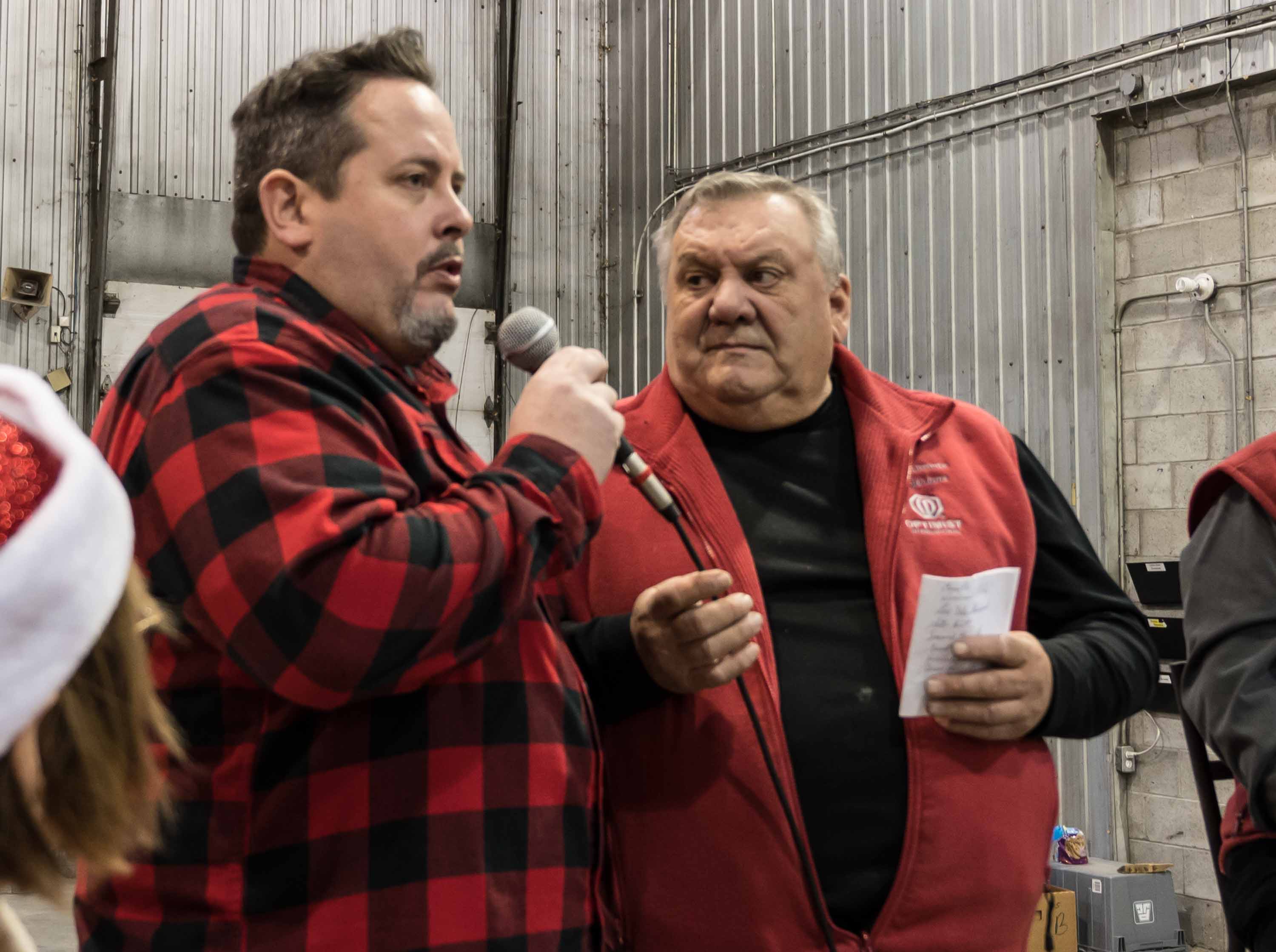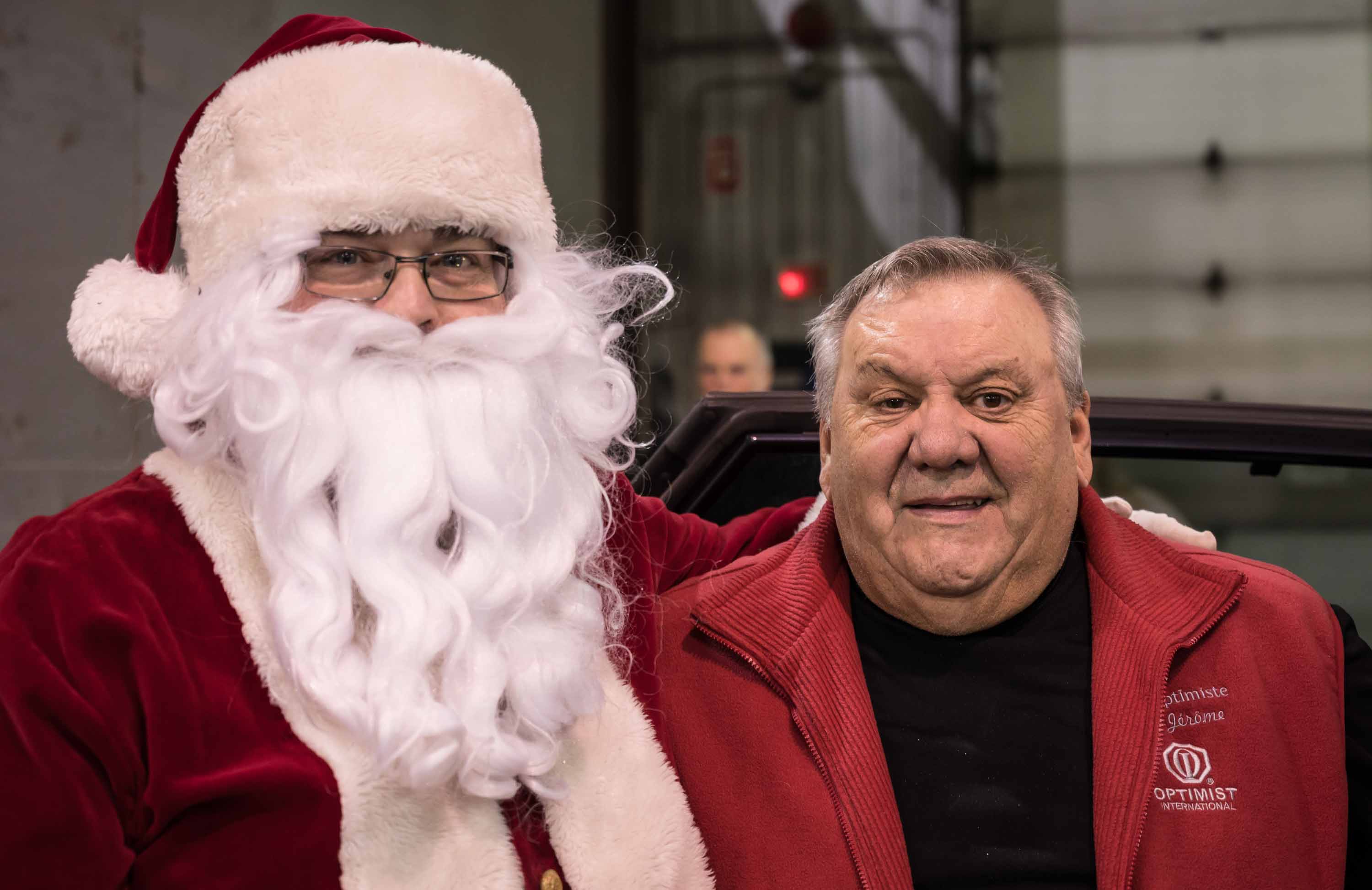Les bénévoles du club Optimiste responsables de la distribution des paniers. On y trouve Pierre Gohier, la présidente Johanne Crépeau, Lise DelaSablonnière, le Père Noël, Line Martin, Serge Barrette, Gérard Bourcier et à l'arrière Normand Piché, Jacques Rivard, Pierre DelaSablonnière et Gilles Huot.Guy Mérédith de la compagnie Soucy Baron était sur place pour donner un coup de main. On l'aperçoit ici en compagnie de l'organisateur responsable de la collecte, Normand Piché. Soucy Baron, en plus de soutenir l'événement depuis de nombreuses années, à organisé cette année une collecte qui lui a permis de verser 1176$ en argfent pour la cause. Monsieur Mérédith était accompagné de Pierre Provencher et Christina Courcy, absents sur la photo.Installés bien au chaud dans un garage prêté par la compagnie Transcobec, les bénévoles travaillent à la chaîne pour remplir les boîtes de provisions.Serge Barrette, fidèle au rendez-vous, coordonnait le remplissage des paniers.Pascal Gauthier jouait des airs de Noël pour rythmer le travail des nombreux lutins.Des bénévoles de tous les âges ont participé à l'opération.L'identité du Père Noël reste toujours secrète, mais si vous avez des questions, prière de vous adresser à Jean Desormeaux Jr. ou Normand Piché.