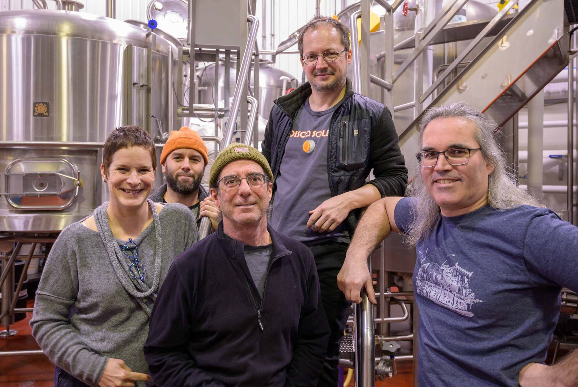En plein brassage: quelques membres de l'équipe du Dieu du Ciel, dont Isabelle Charbonneau, Étienne Tremblay, Normand Gobeille, Stéphane Ostiguy et Jean-François Gravel.