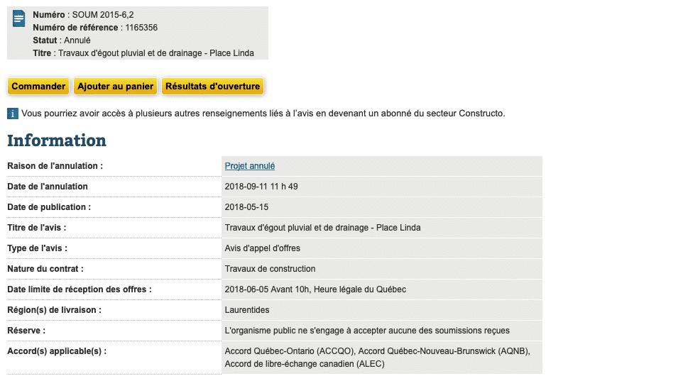 En mai 2018, Saint-Jérôme a finalement publié un appel d'offres en vue de la réalisation des travaux. La Ville a annulé son projet, parce que les soumissions étaient trop levées.