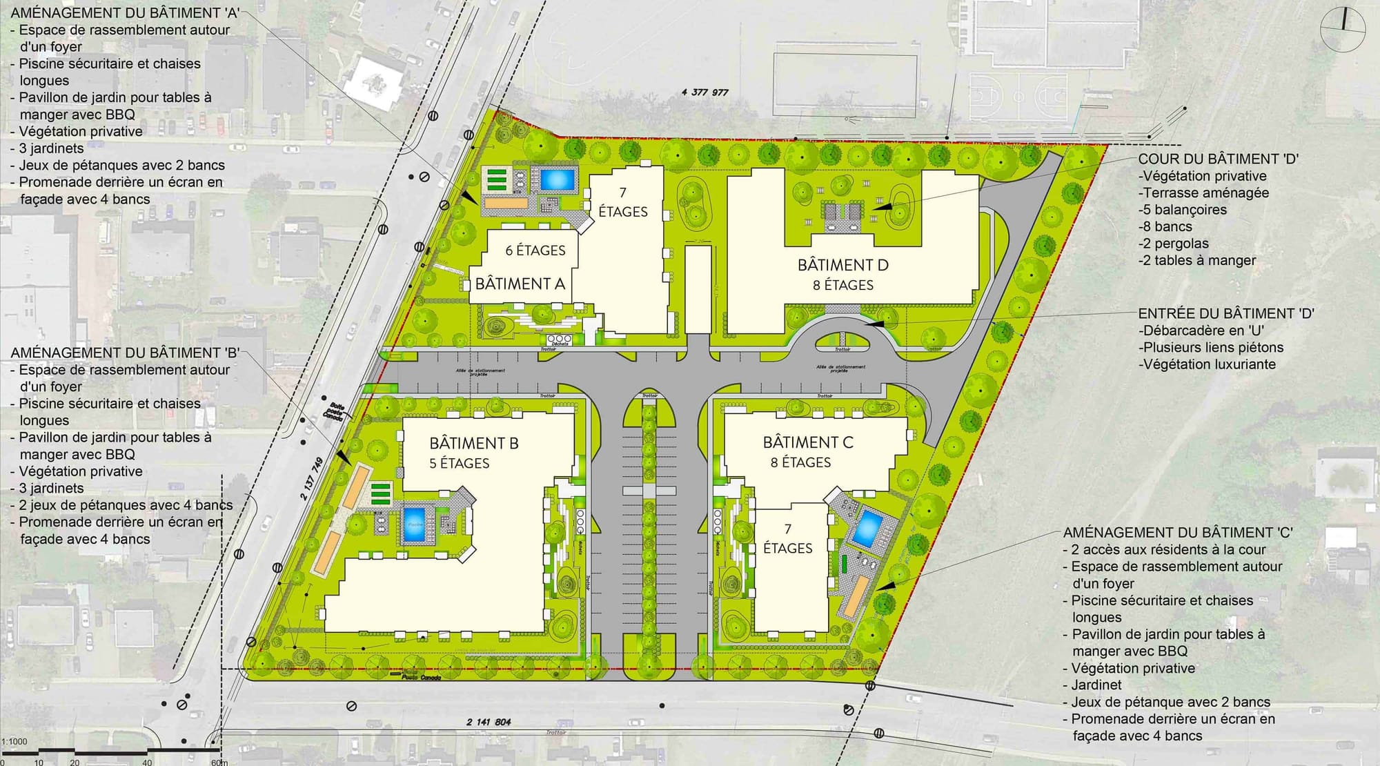 Trois des bâtiments abriteront un total de 422 logements offerts selon une formule que le promoteur appelle Accès Trigone, soit des condos locatifs offrant un loyer tout inclus qui comprend, en plus du loyer, des électroménagers, l'électricité, l'eau chaude, le chauffage et la climatisation, ainsi que des services de base de téléphonie, internet et câblodistribution.