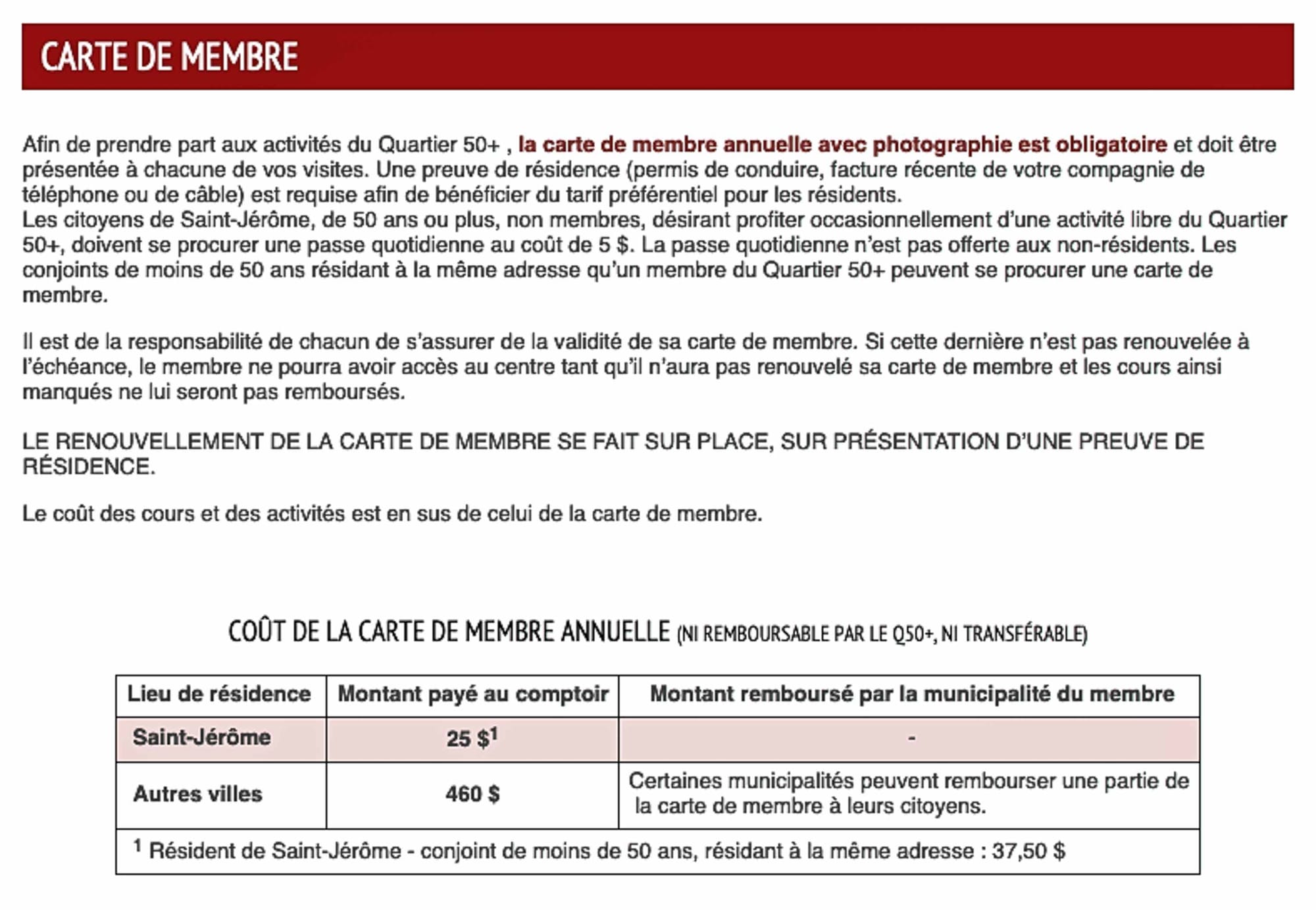Le tarif annuel pour les résidents de Saint-Jérôme est de 25$.