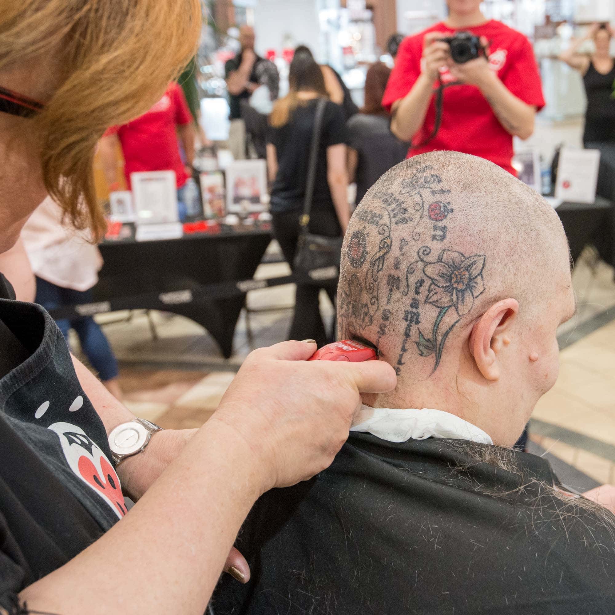 Jacline St-Onge est elle-même une survivante du cancer ainsi qu’une bénévole active du Défi têtes rasées. Non seulement son rasage a permis de générer des dons de 347$, comme Giancarlo, mais en plus il a révélé une surprise: un tatouage qui décore l’arrière de sa tête.