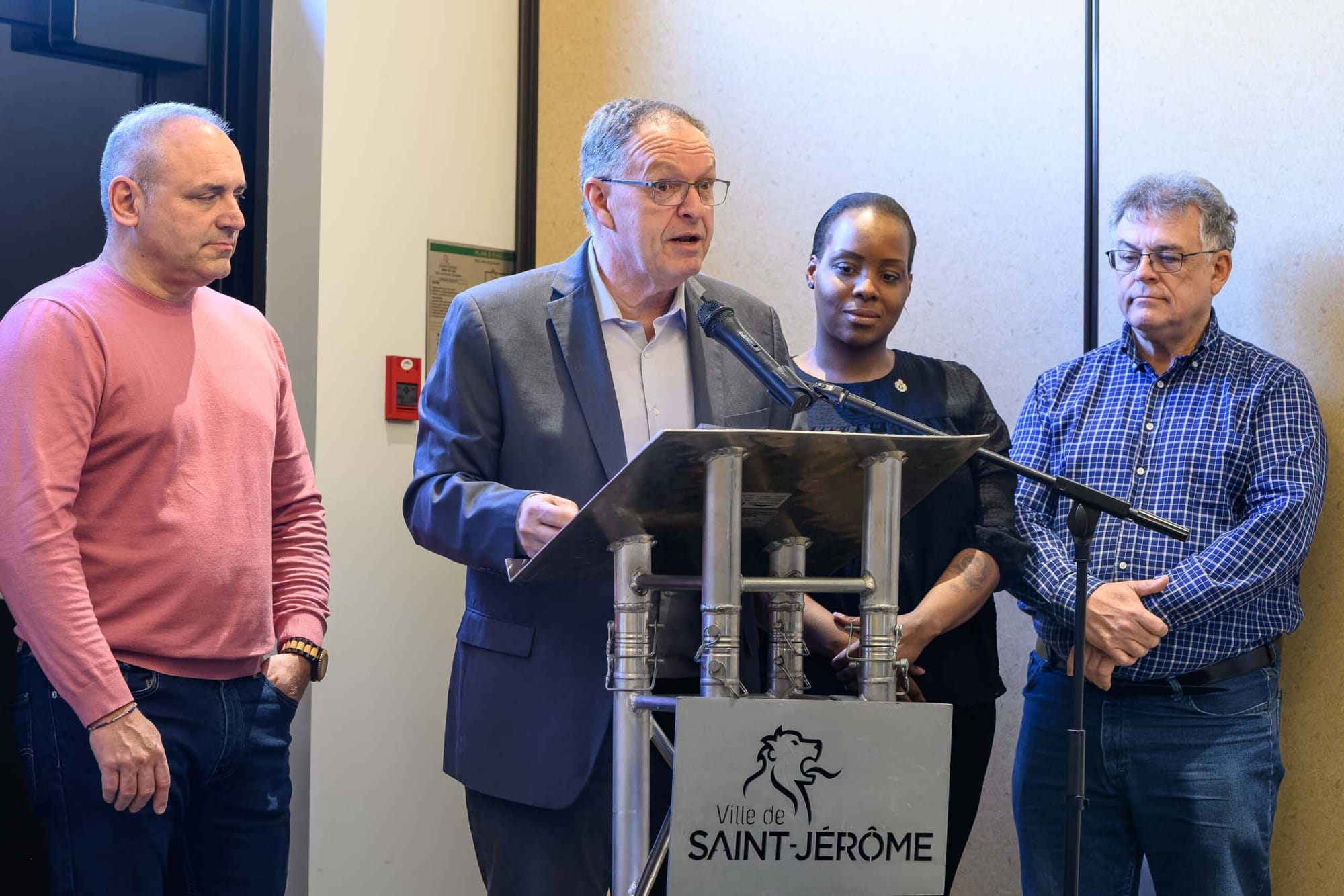 Le maire Marc Bourcier annonçait que la Ville de Saint-Jérôme mettra sur pied des plateaux de travail et y consacrera 80 000$ dans les 12 mois à venir. Il a souligné la collaboration des employés de la Ville à cette initiative, noyamment la « flexibilité » des syndicats, et il a rappelé qu'un travail est souvent la pierre d'assise pour que des personnes intègrent la société. Il a d'ailleurs repris les mots de Félix Leclerc, qui chantait « la meilleure façon de tuer un homme c'est d'le payer à ne rien faire. »