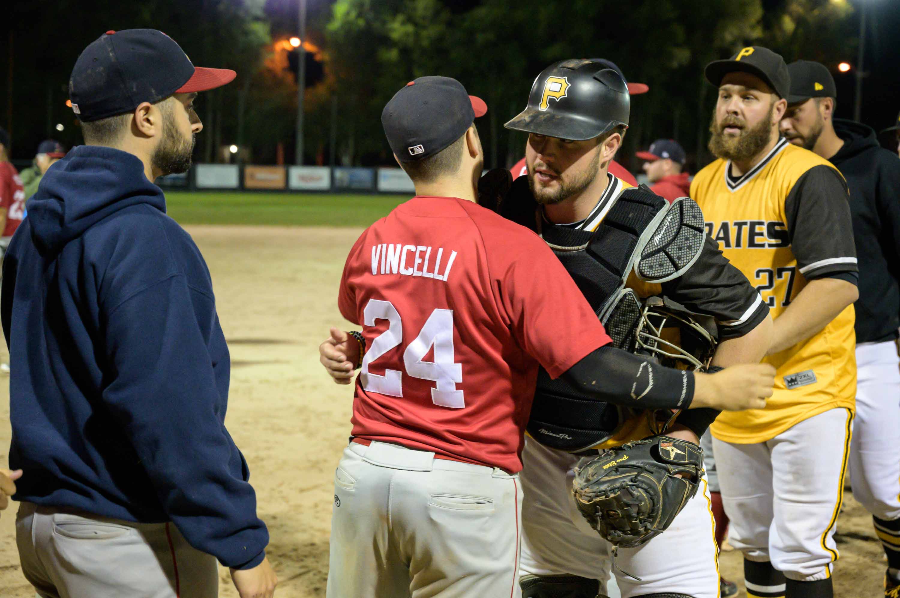 Offensivement, les Pirates ont inscrit trois points en troisième manche. Un circuit solo de Drake Yoshioka, un optionnel de Lafrenière et un simple de Vincent Knerr ont donné l’avance aux visiteurs. Une balle passée et un simple de Symon Laplante ont porté le pointage à 5-0 à la manche suivante avant de voir trois autres points en début de cinquième. Laplante, atteint d’un lancer ainsi que Nicolas Loiseau et Mathieu Bisonnette sur des ballons sacrifice ont produit les points. Le pointage a été complété en début de septième manche sur un but sur balles de Dany Deschamps et un simple de Lafrenière. Au monticule pour les Cardinaux, James Vardy a encaissé la défaite.