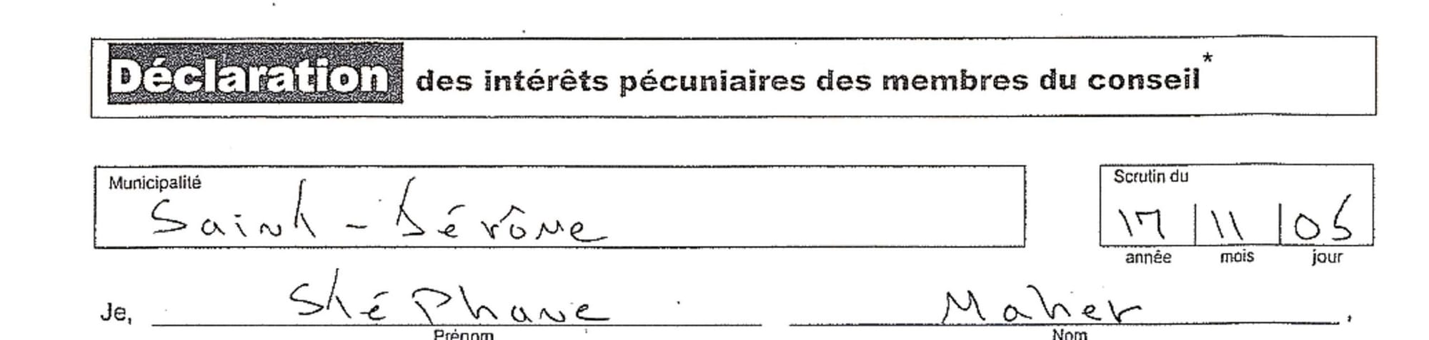 TopoLocal a examiné tous les bulletins, qui semblent par ailleurs tout à fait conformes. Nous avons constaté que la plupart des candidats ont obtenu des signatures de voisins ou de résidents de leurs quartier. Les bulletins sont remplis à la main, et la calligraphie des inscriptions est très disparate pour tous les bulletins sauf trois, ceux de Stéphane Maher, Sophie Saint-Gelais et Mylène Laframboise, qui semblent avoir été remplis en partie par la même personne. On retrouve d'ailleurs la même calligraphie sur une déclaration publique d'intérêt pécuniaires concernant Stéphane Maher en 2017. Nos photos en témoignent.