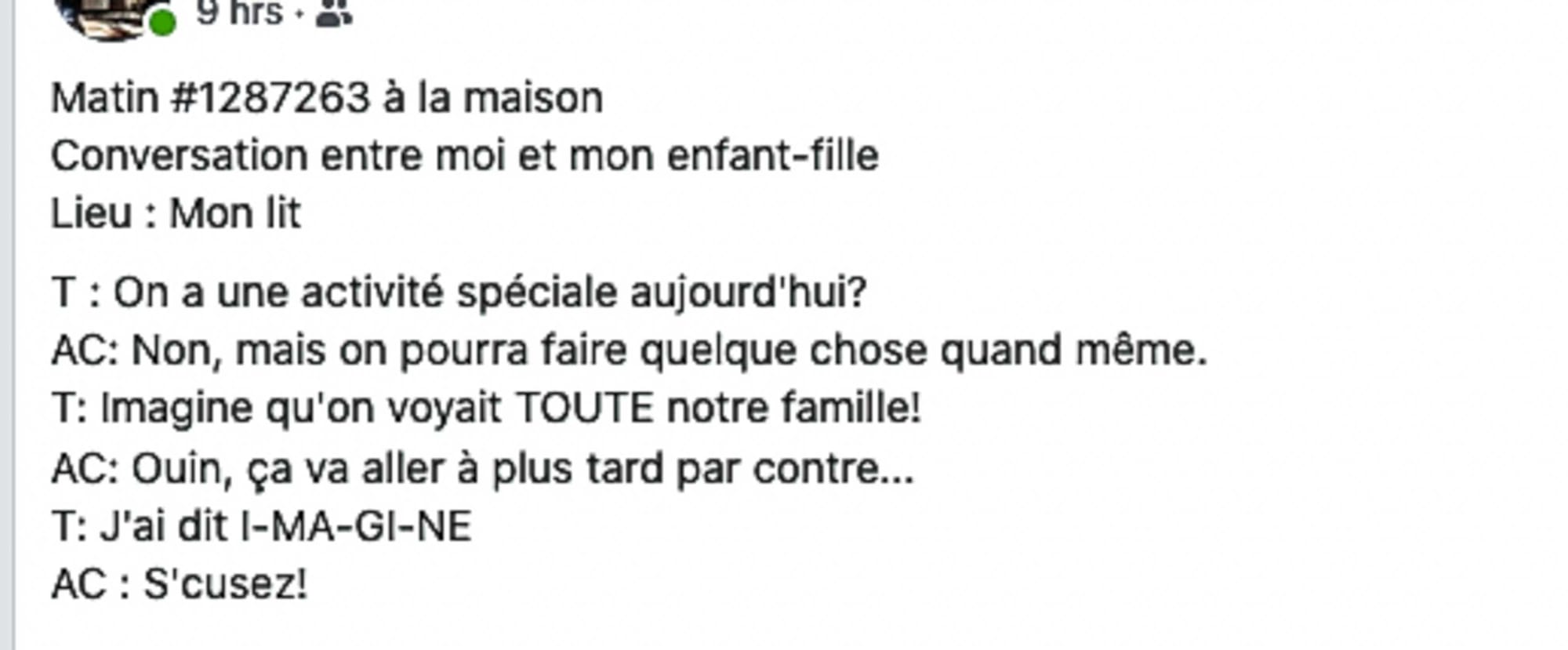 Enfin, il y a les réseaux sociaux. Je partage avec vous cet extrait de conversation entre ma petite-fille et sa mère. Dans la conversation qui suit, T c’est ma petite-fille, et AC, sa mère.