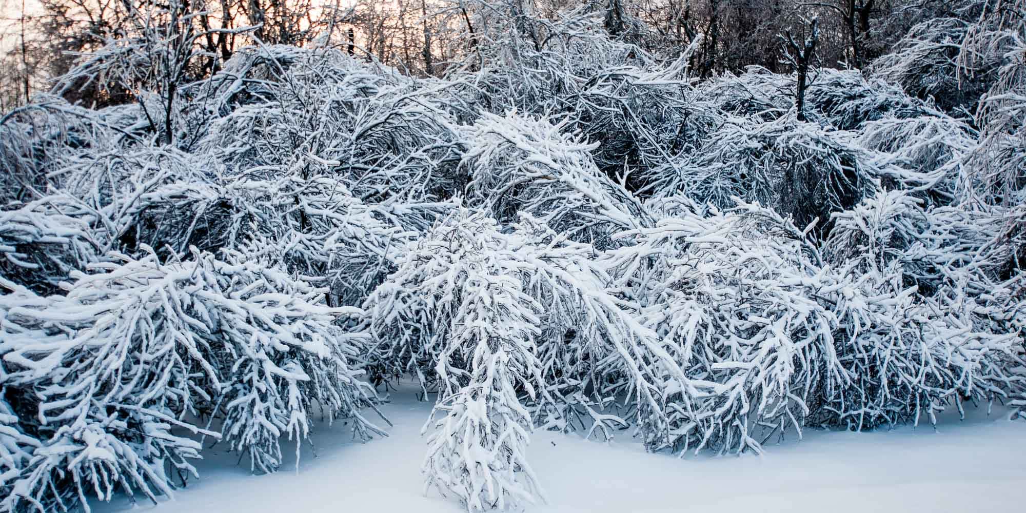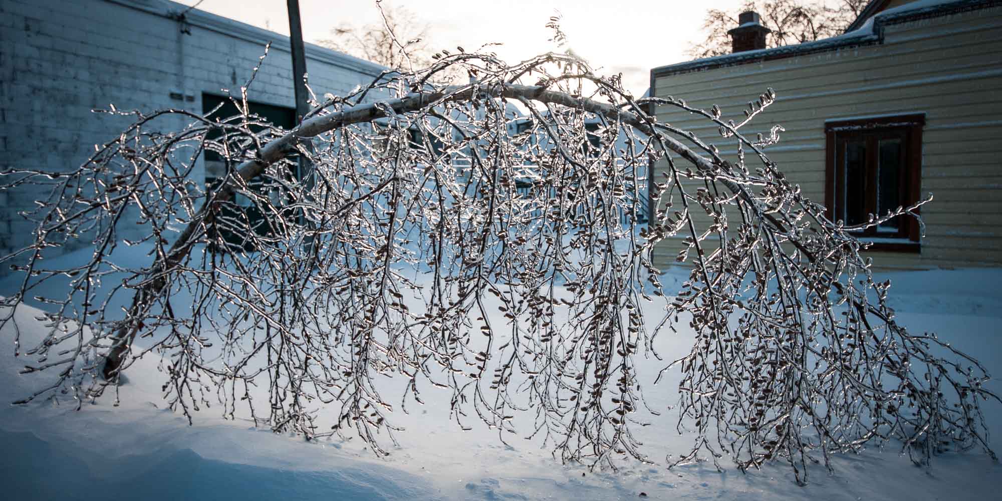 Dans la fable, le roseau plie mais ne se rompt pas. C'est ce qu'espère le propriétaire de ce bouleau, dont la cime a été rabattue au sol par le poids de la glace.