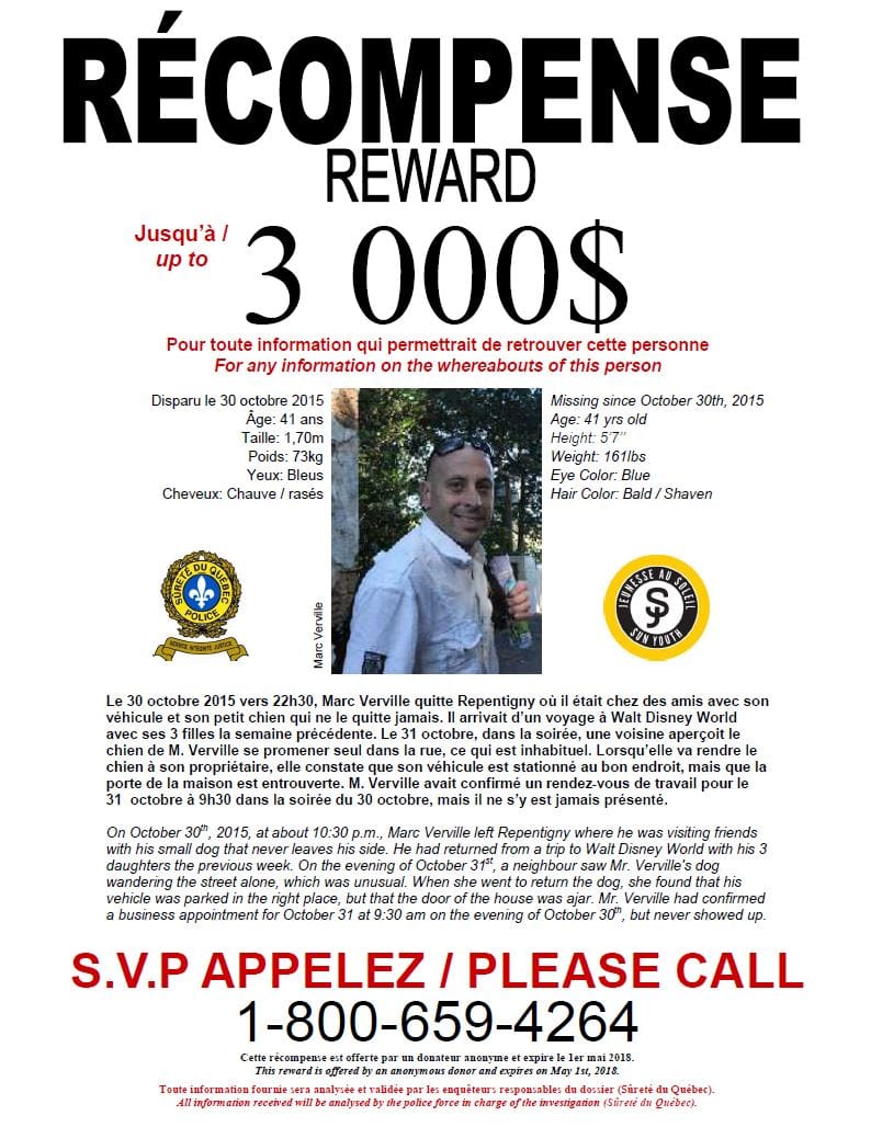 Rappelons que Marc Verville, alors âgé de 39 ans, a été vu pour la dernière fois le 30 octobre 2015 vers 22h30, alors qu’il quittait la ville de Repentigny pour se rendre à son lieu de résidence à Mille-Îles. Il n’a jamais été revu depuis.