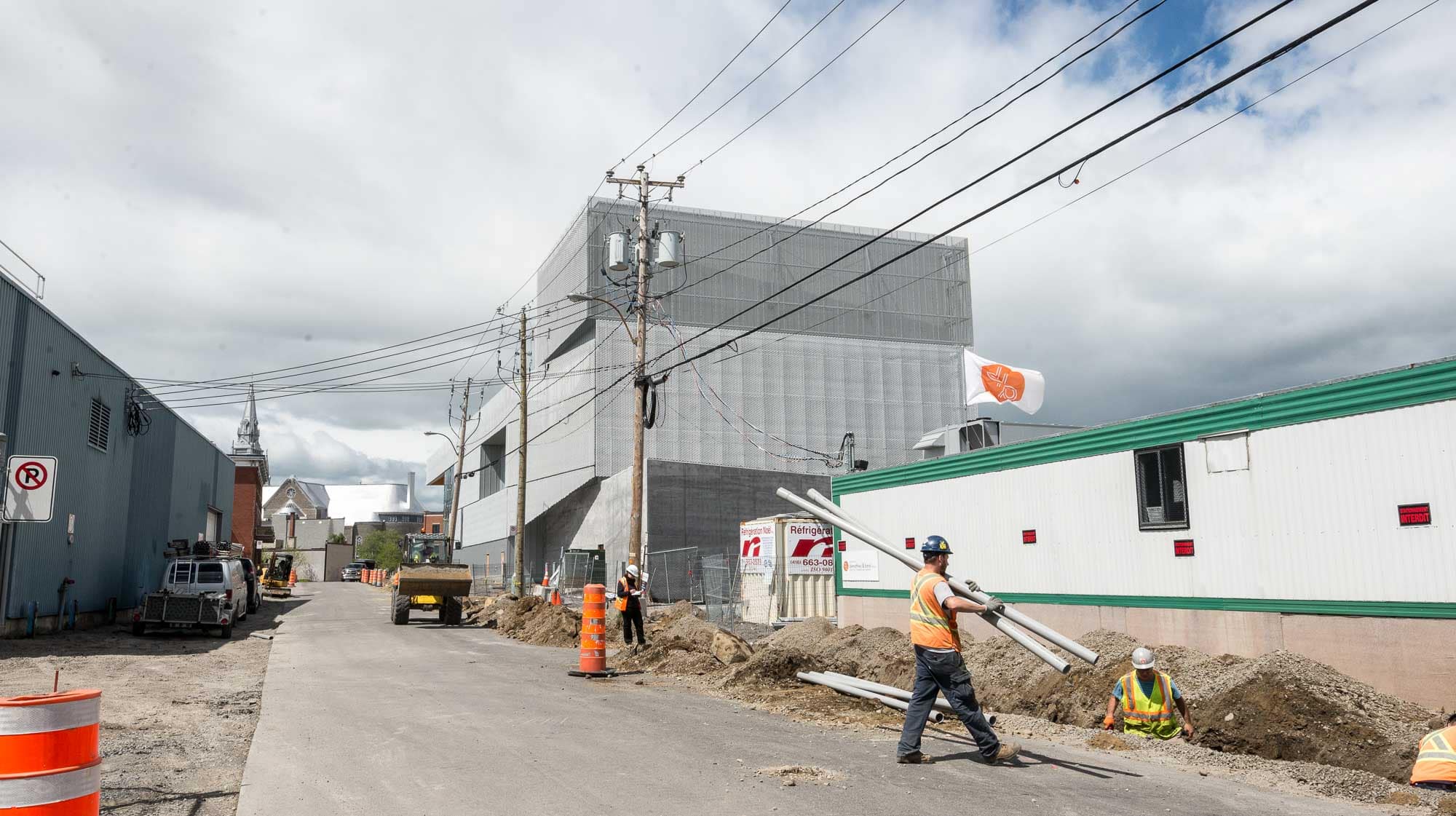 À l'exception du grand escalier qui donnera sur la Place des festivités, l'extérieur du bâtiment prend un air de plus en plus achevé. Cette semaine, l'aménagement des bordures de béton du stationnement donne aussi une meilleure idée de la configuration finale des lieux entourant la salle.