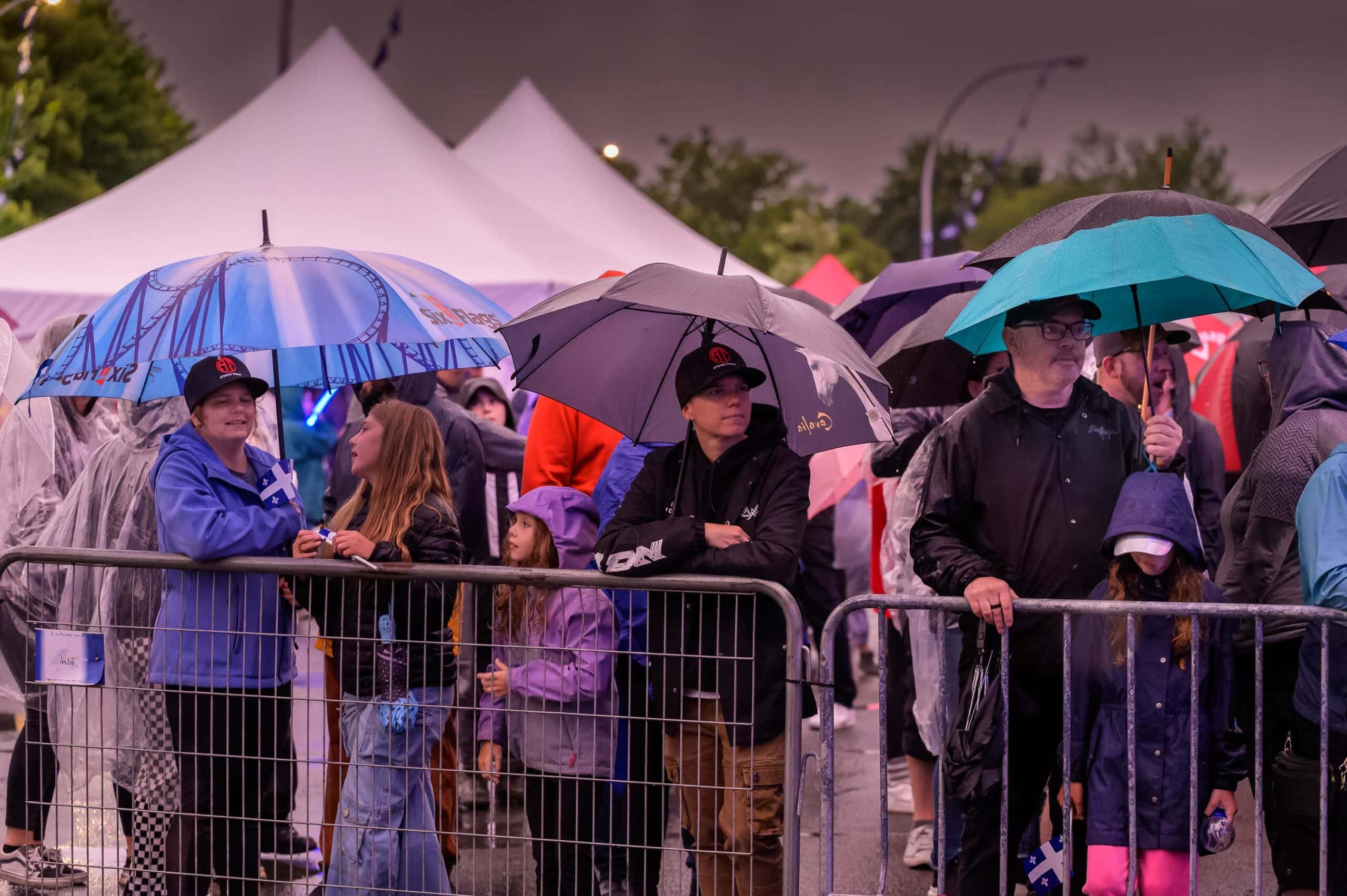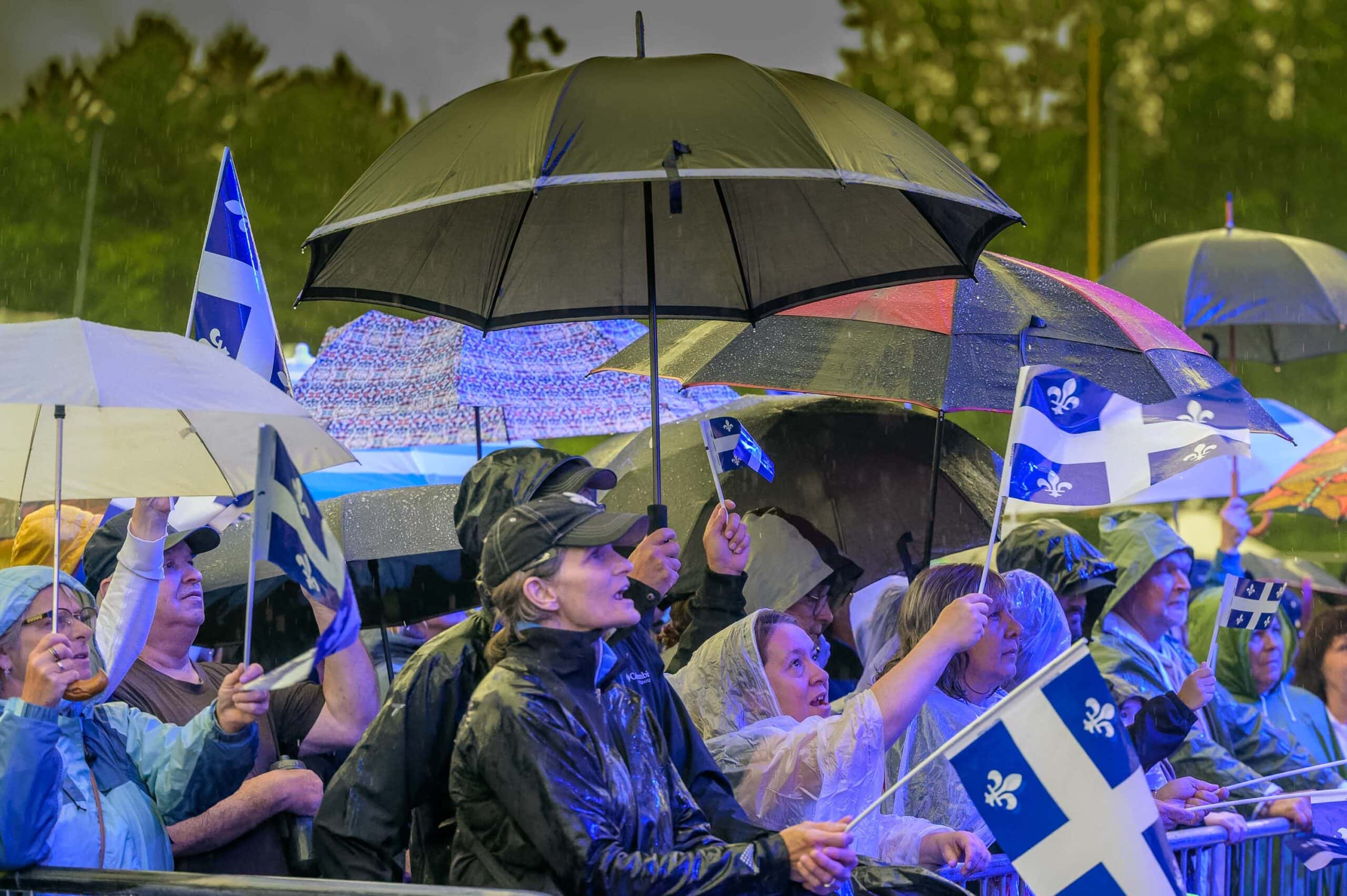 On a refermé son imper, enfoncé un peu son chapeau de pluie, on s'est attroupé sous les parapluies, et ensemble, les gens ont attendu patiemment, implorant le ciel de se dégager, poussant des cris de ralliement, à l'invitation de l'animateur Danny Berger, pour faire peur à la pluie.