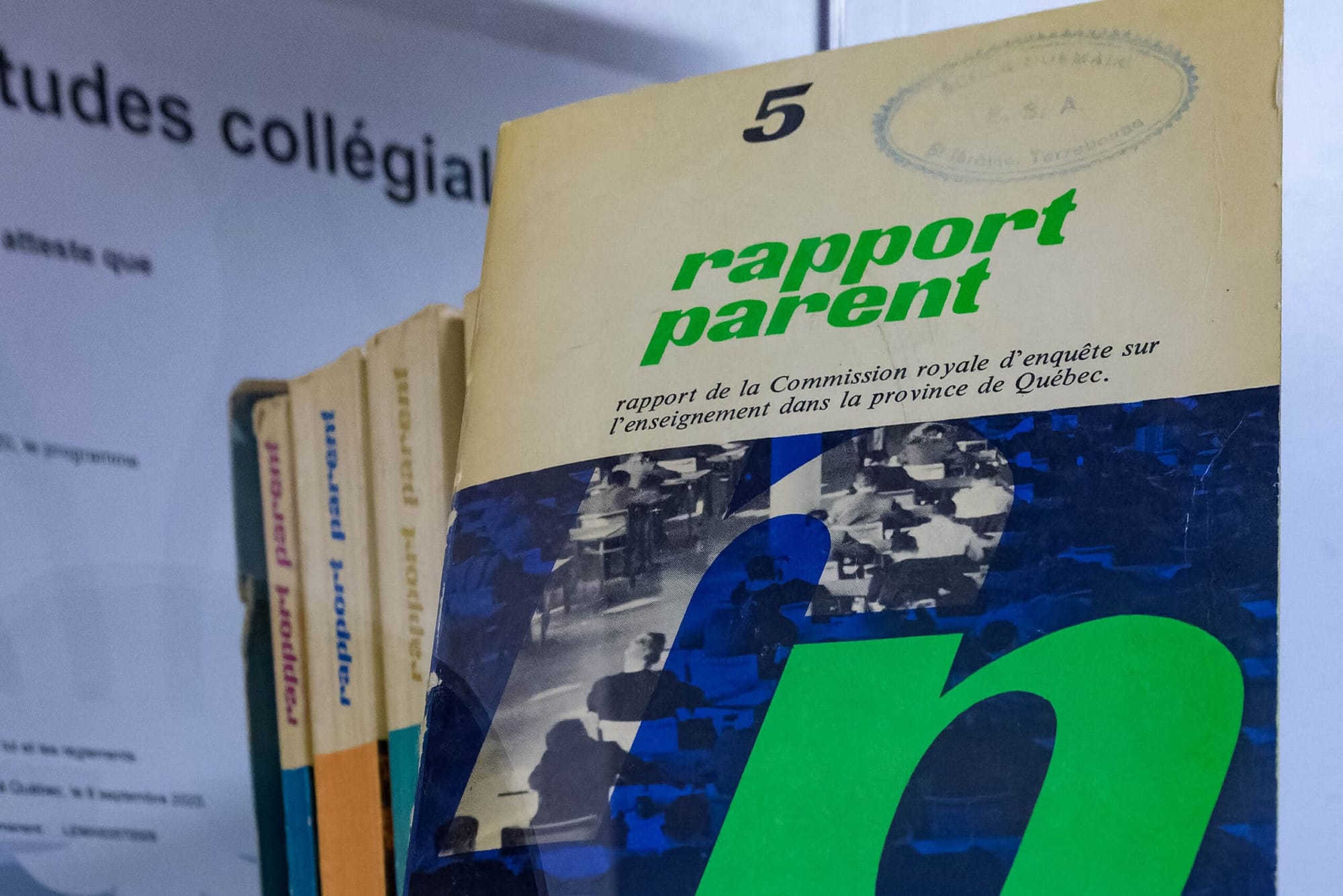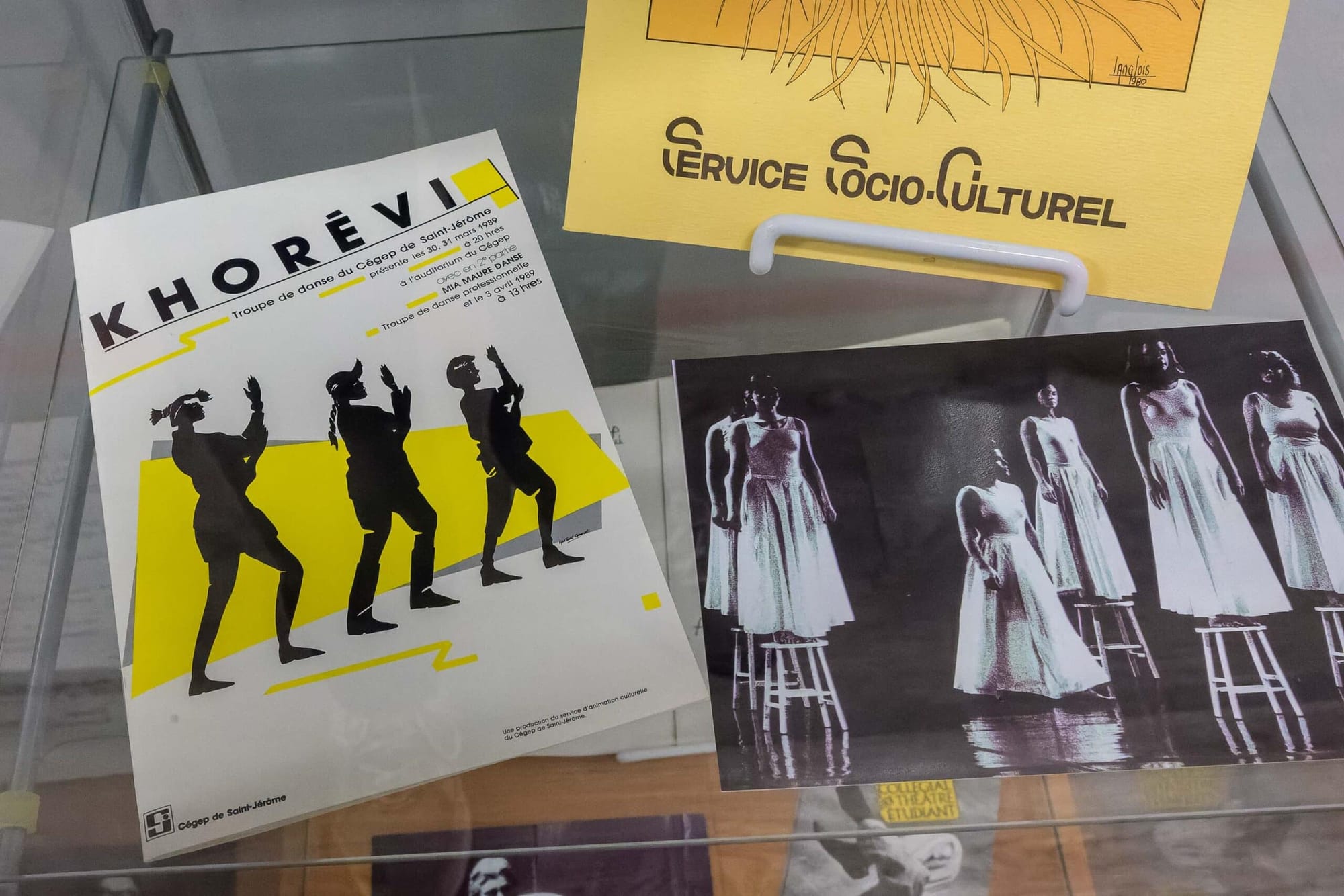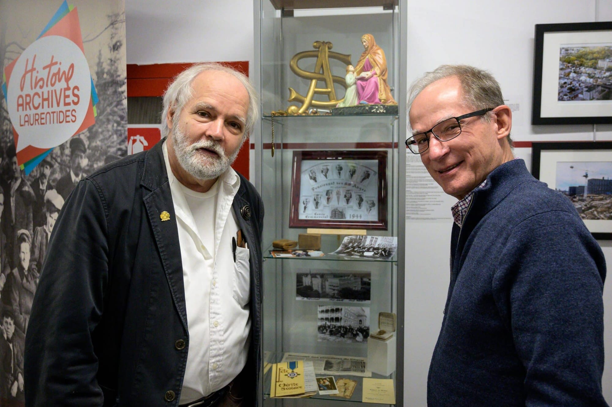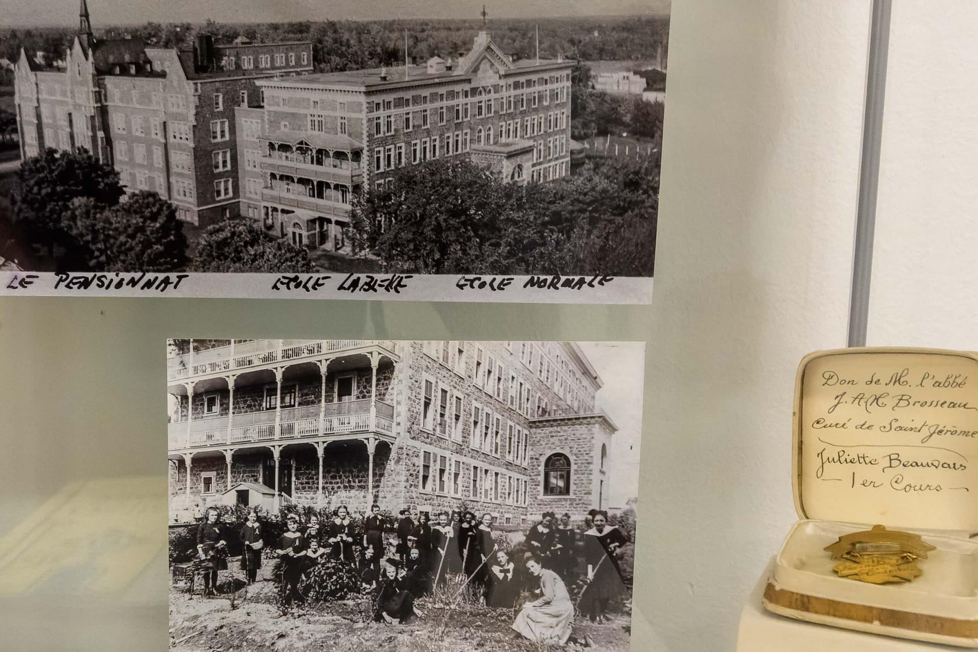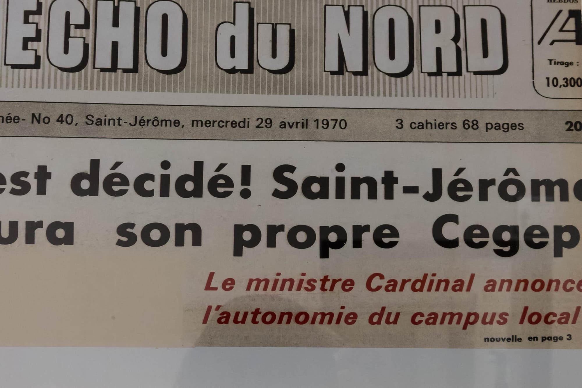 L'édifice qui a vu naître le Cégep de Saint-Jérôme était un pensionnat des Soeurs de Sainte-Anne qui se nommait le Pensionnat des Saints-Anges. Photos des exhibits par Charles Michaud/TopoLocalL'école normale installée dans le même édifice formait des enseignantes, un nom qui se conjuguait majoritairement au féminin à l'époque. Ici une photo d'un groupe de finissantes.Les vitrines de l'exposition montrent des photos des bâtiments de l'époque et des souvenirs de premières classes. Photo Charles Michaud/TopoLocalAu milieu des années 1970, le collège subit une première modernisation qui aboutira avec la démolition de la chapelle du couvent, superbe édifice dont la structure avait été jugée inutilisable. Des étudiants et des profs avaient présenté un spectacle/protestation intitulé on connaît ça le béton. Photo d'archivesDémolition de la chapelle de l'édifice de la rue Fournier. Vers 1974. Photo numérisée tirée des archives de Gleason ThébergeL'exposition reproduit cette première page de l'Écho du Nord du 29 avril 1970 qui annonce la création du Cégep de Saint-Jérôme. C'est Jean-Guy Cardinal, alors ministre de l'Éducation, qui en fait l'annonce. Cardinal deviendra député de Prévost en 1976.Cet exemplaire un peu écorné du rapport Parent, la pierre d'assise de la création des cégeps et de la laïcisation de l'enseignement au Québec, fait partie de la collection.Photo d'une étudiante en sciences infirmières, encore un des départements les plus importants du Cégep de Saint-Jérôme.Un exemplaire jauni du journal L'Archange, un journal étudiant résolument de gauche dans les années 1970. Un imprimeur local avait même refusé de l'imprimer, décision vivement contestée par ses éditeurs.Autre document-témoin de son époque: une pétition demandant l'enlèvement des « affreux pare-soleils qui donnent au cégep l'allure d'une prison ».Une photo d'une des premières mises au jeu officielles des Cheminots de Saint-Jérôme, en octobre 1980, effectuée par le légendaire Maurice «Rocket» Richard, en compagnie du maire de Saint-Jérôme de l'époque, Bernard Parent. Quelques autres personnalités locales sont plus ou moins visibles sur la photo, donc le DG du cégep Claude Lalonde, le DG du Conseil de développement des Laurentides et pionnier de la conservation du P'tit train du Nord Serge Boucher, Yves Nadon, lui-même une légende sportive locale, de même que la patineuse Julie Brault et Roger Landry, du Cégep de Saint-Jérôme.Une vitrine rappelle les nombreuses troupes de danse qui se sont succédées au cégep. On disait à l'époque «danse moderne» mais la troupe Khorévi, consacrée à la danse contemporaine, est toujours active et attachée au Cégep.Un disque vinyle 45 tours produit à l'époque par le service d'animation culturelle du Cégep.Plusieurs professeurs du cégep ont publié des volumes sur divers sujets, dont le document de référence par excellence sur l'histoire des Laurentides de l'auteur et historien Serge Laurin, montré ici sur la photo. Les vitrines font voir également d'autres oeuvres connues, dont un exemplaire de la pièce Encore un peu du jérômien Serge Mercier, dont Radio-Canada avait fait le sujet d'un de ses Beaux dimanches.Gleason Théberge, enseignant du cégep à la retraite, en compagnie de Louis Parent, membre du conseil d'administration de HAL. Photo par Charles Michaud/TopoLocal