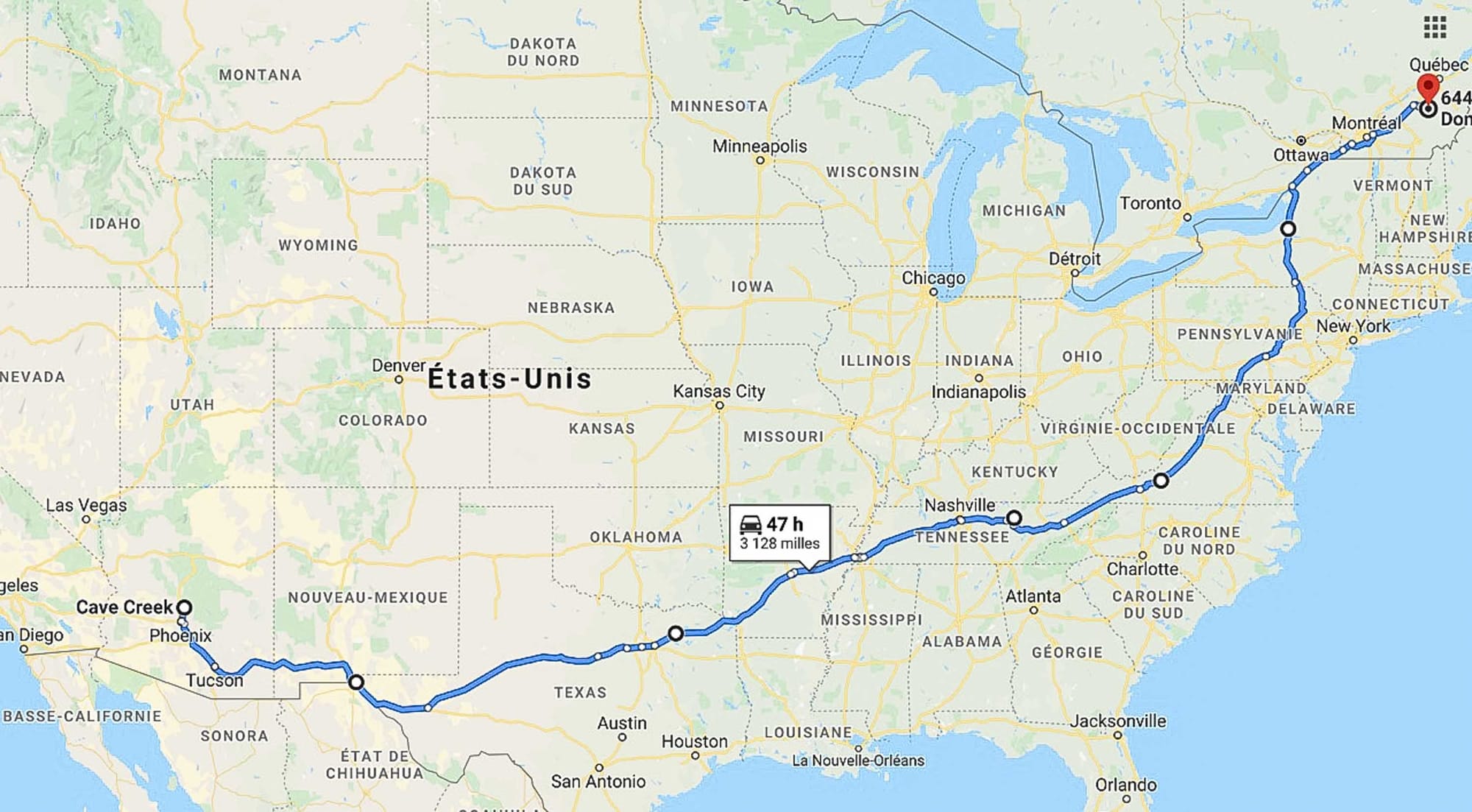 La carte ci-jointe vous donne une idée de notre trajet. Nous roulons 4 à 5 heures par jour et on couche à chaque soir dans un camping. On arrête tôt, une bonne douche, chaises de patio et une bouteille de vin! Depuis que nous faisons cela nos voyages sont plus beaux et moins pénibles.